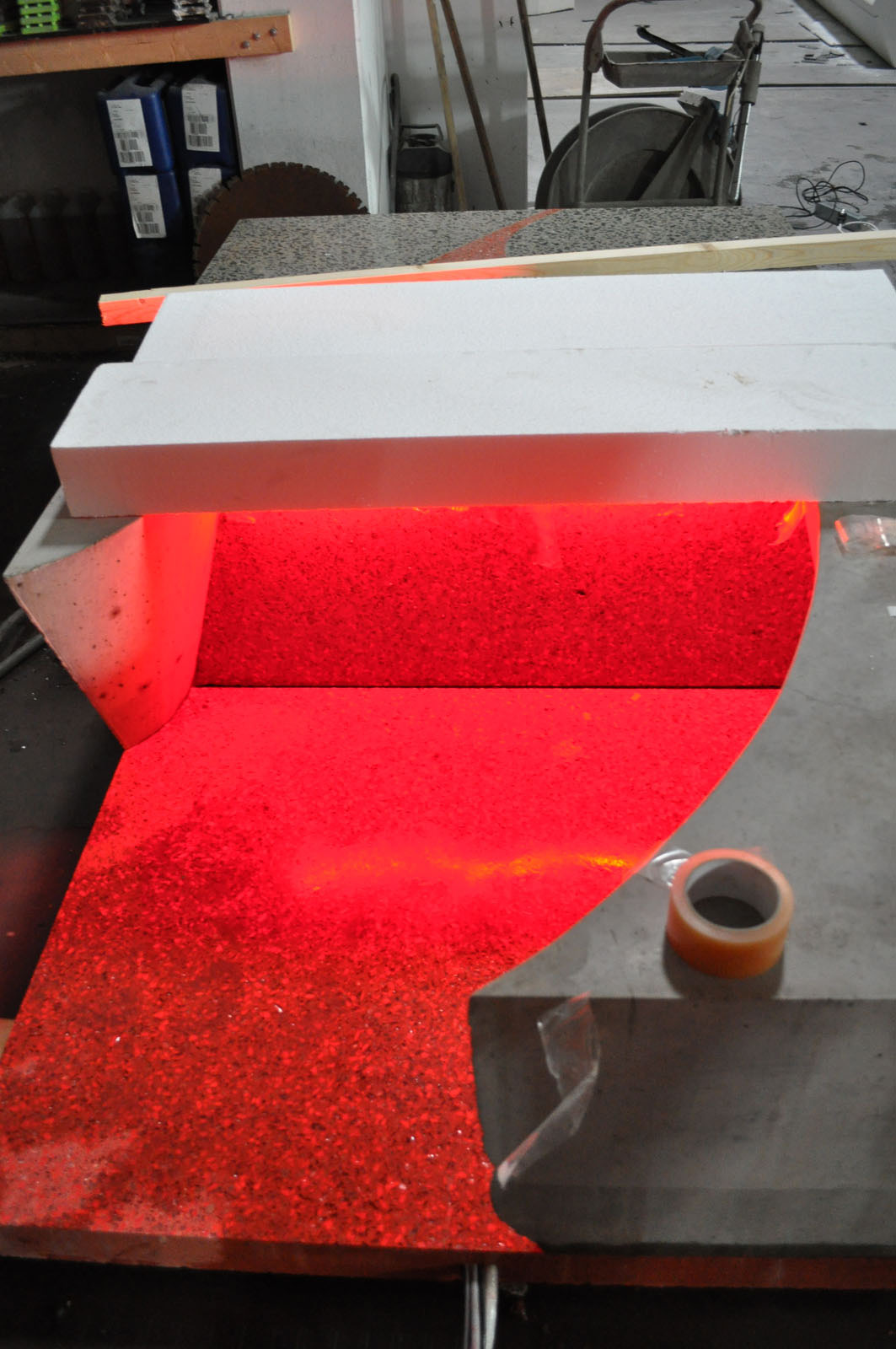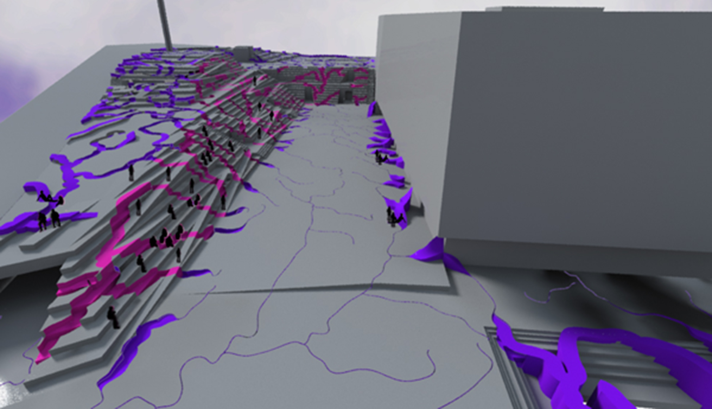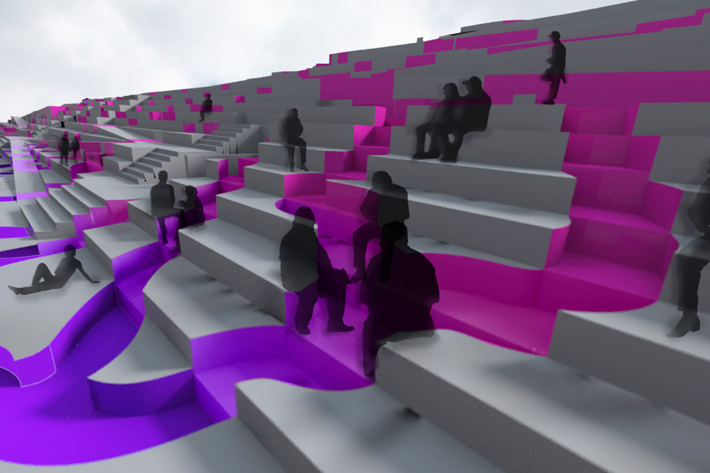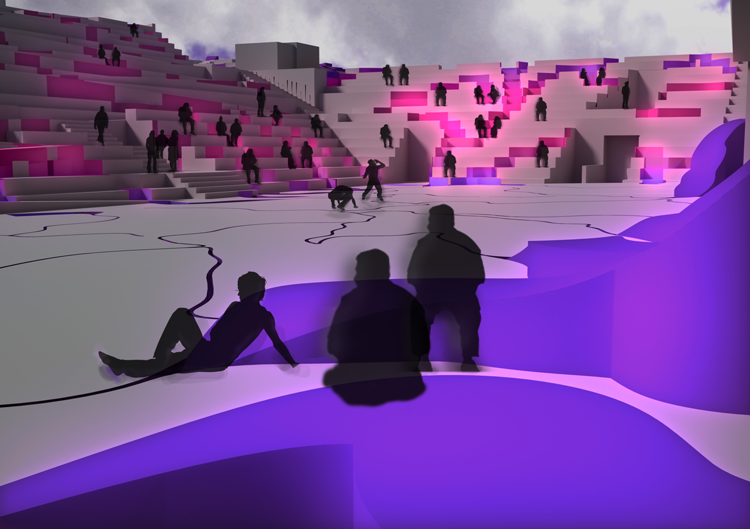Like rivers & rivulets: cuts are made down the amphitheater, through the existent seats of the amphitheater. The seats of the amphitheater are frontal, you’re sitting at a theater, you’re facing front, your attention is directed toward the stage & the performance below…But, once the frontal seats are intersected, the world has changed, there’s another way of looking at the world now, single focus is interrupted & the plot thickens: in the middle of seats facing front there are pockets of transversal seats, oppositional (or complemental) seats, face-to-face seats…