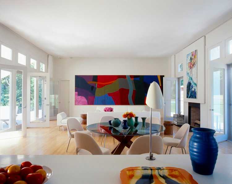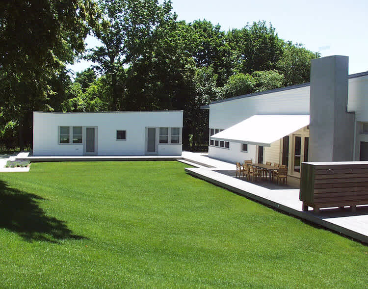 With their minimalist exteriors, the Shelter Island house, and its smaller guest house perch just below the crest of a neatly sloping landscape. The main house is four times longer than it is wide, with a one hundred-foot (thirty meter) roof forming one continuous slope, the last eight feet of which are cantilevering over the deck. This overhang provides an informal entrance, a kind of portico, to the other areas of the property – the guest house, the rear terraces, and the swimming pool.