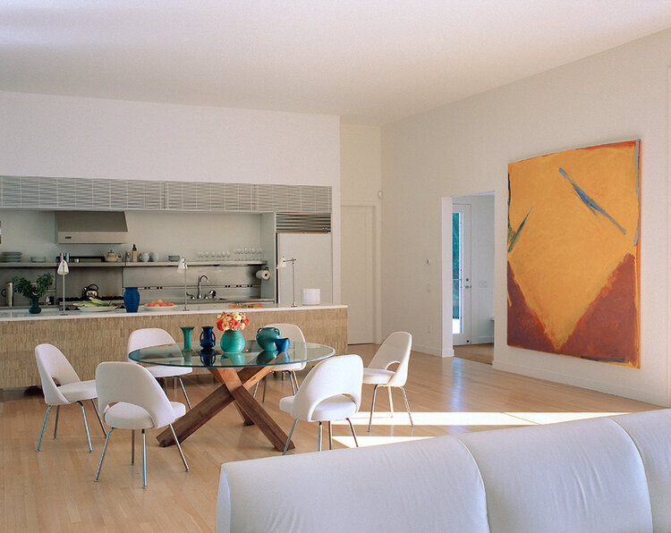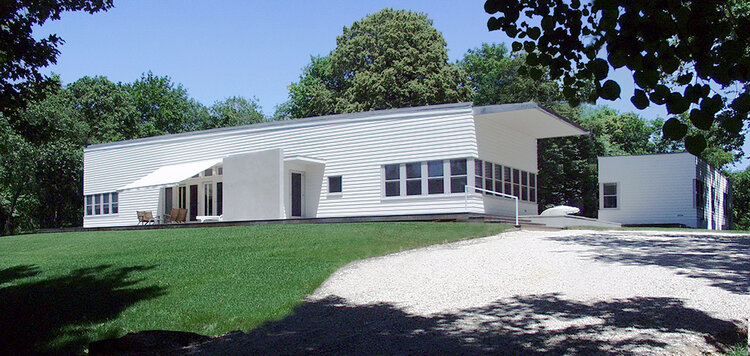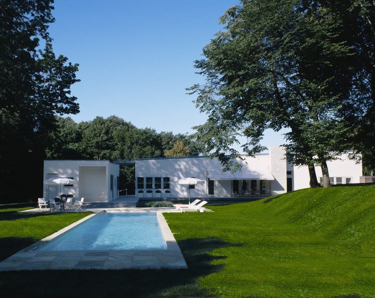 With their minimalist exteriors, the Shelter Island house, and its smaller guest house perch just below the crest of a neatly sloping landscape. The main house is four times longer than it is wide, with a one hundred-foot (thirty meter) roof forming one continuous slope, the last eight feet of which are cantilevering over the deck. This overhang provides an informal entrance, a kind of portico, to the other areas of the property – the guest house, the rear terraces, and the swimming pool.