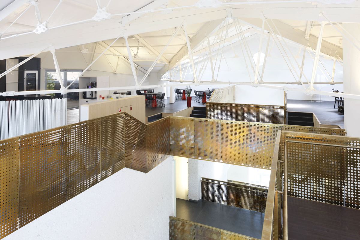 In Amsterdam, on the Singel Gracht, the renovated building is a four-story brick "U" merging internally with a new "sponge" pavilion. While the exterior expression is one of complimentary contrast (existing brick adjacent to new perforated copper) the interior strategy is one of fusion. The porous architecture of the rectangular pavilion is inscribed with a concept from Morton Feldman's music, "Patterns in a Chromatic Field." The ambition to achieve a space of gossamer optic phenomena with chance-located color is especially effective at night when the color patches reflect in the De Single Canal. The layers of perforated screens are developed in three dimensions, analogous to the "Menger Sponge" principle of openings that are continuously cut in planes and constantly approaching zero volume.