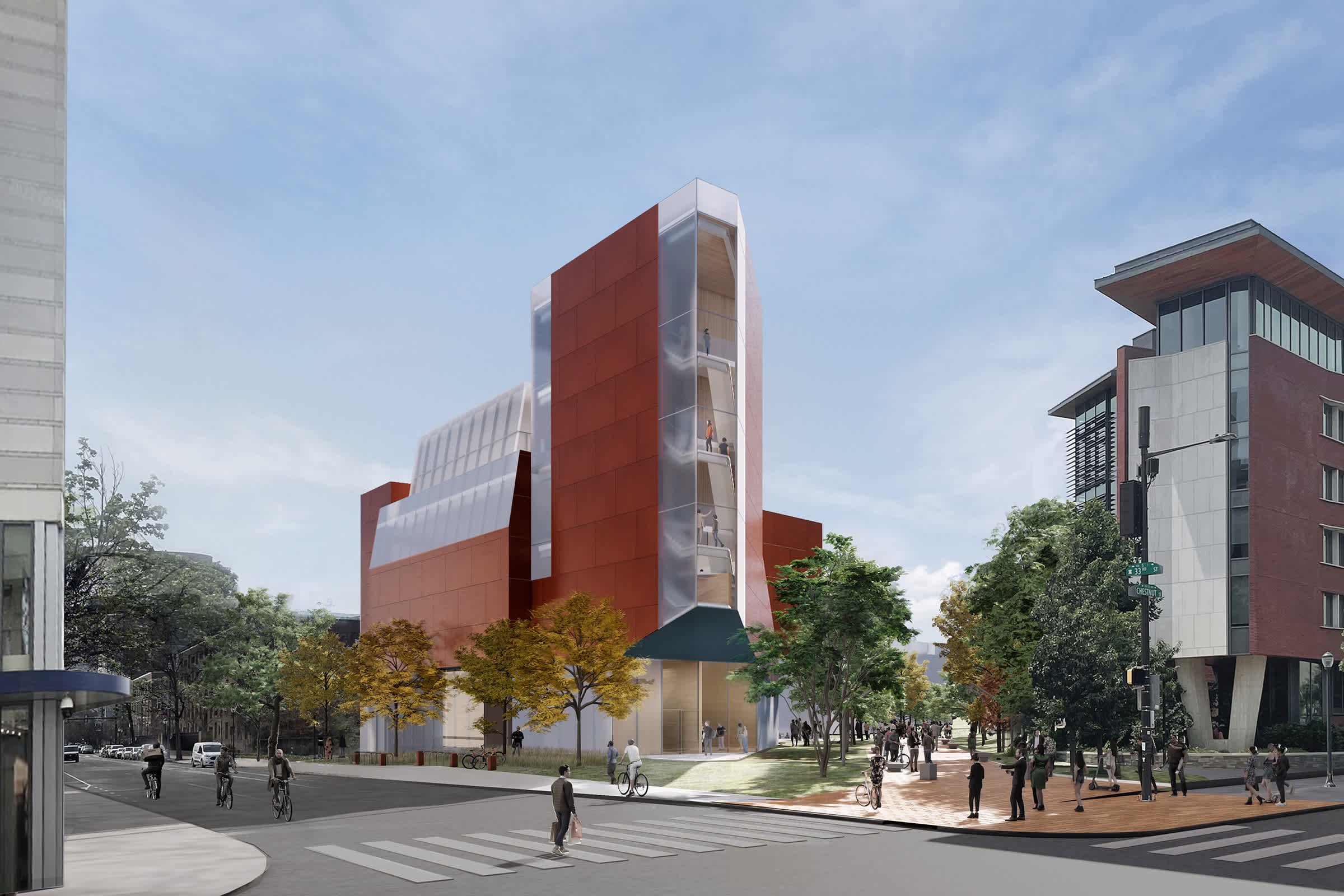 Sited along Woodland Walk and Jenny Holzer’s 125 Years text-based sculpture celebrating the history of women at Penn, the new Center will activate the northeast corner of Penn’s campus, enhancing an inviting gateway while maximizing visibility and accessibility of creative life on campus. The dedicated and flexible student performance and rehearsal venues will support a robust diverse and expanding arts community at the University.
