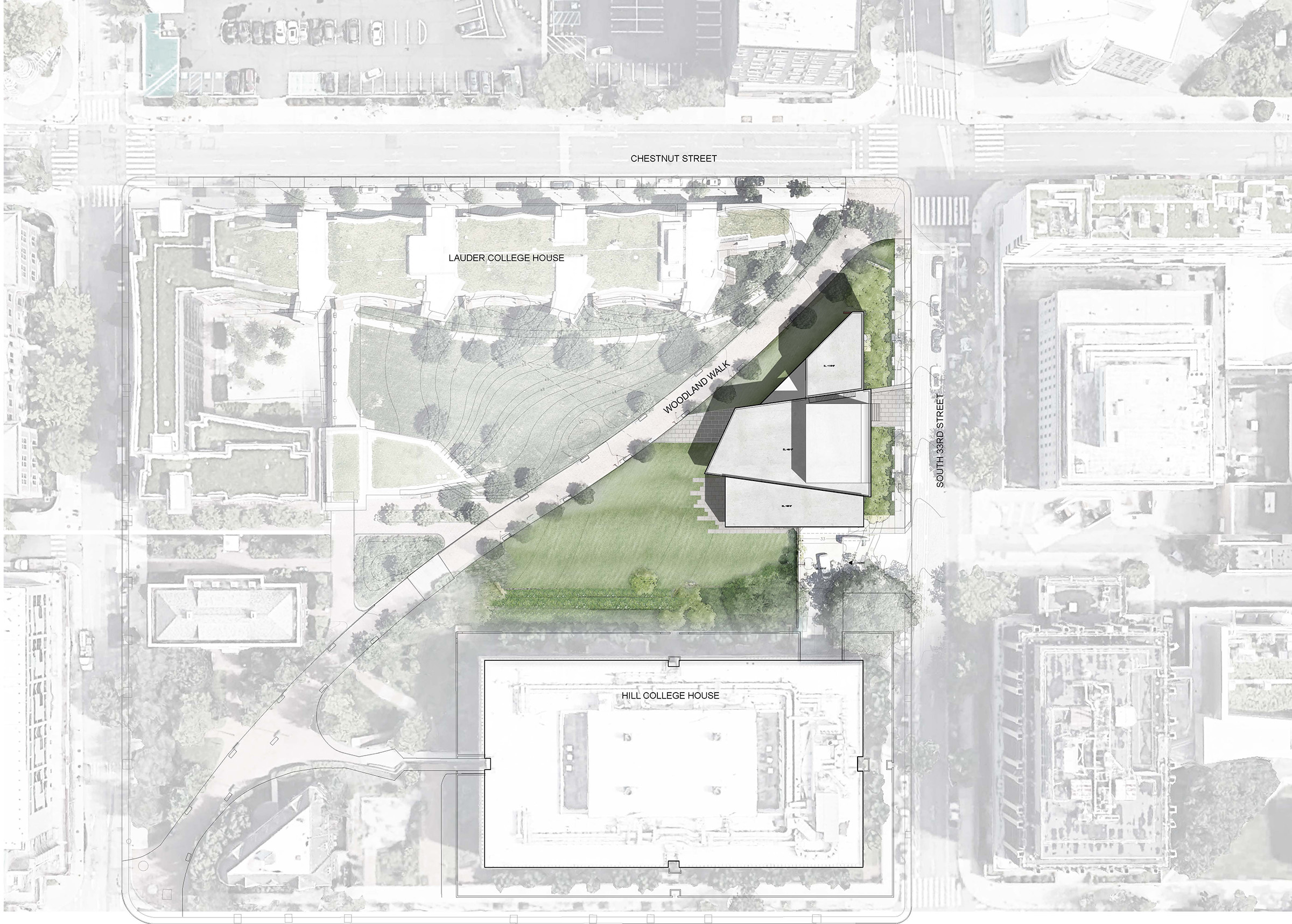 Sited along Woodland Walk and Jenny Holzer’s 125 Years text-based sculpture celebrating the history of women at Penn, the new Center will activate the northeast corner of Penn’s campus, enhancing an inviting gateway while maximizing visibility and accessibility of creative life on campus. The dedicated and flexible student performance and rehearsal venues will support a robust diverse and expanding arts community at the University.