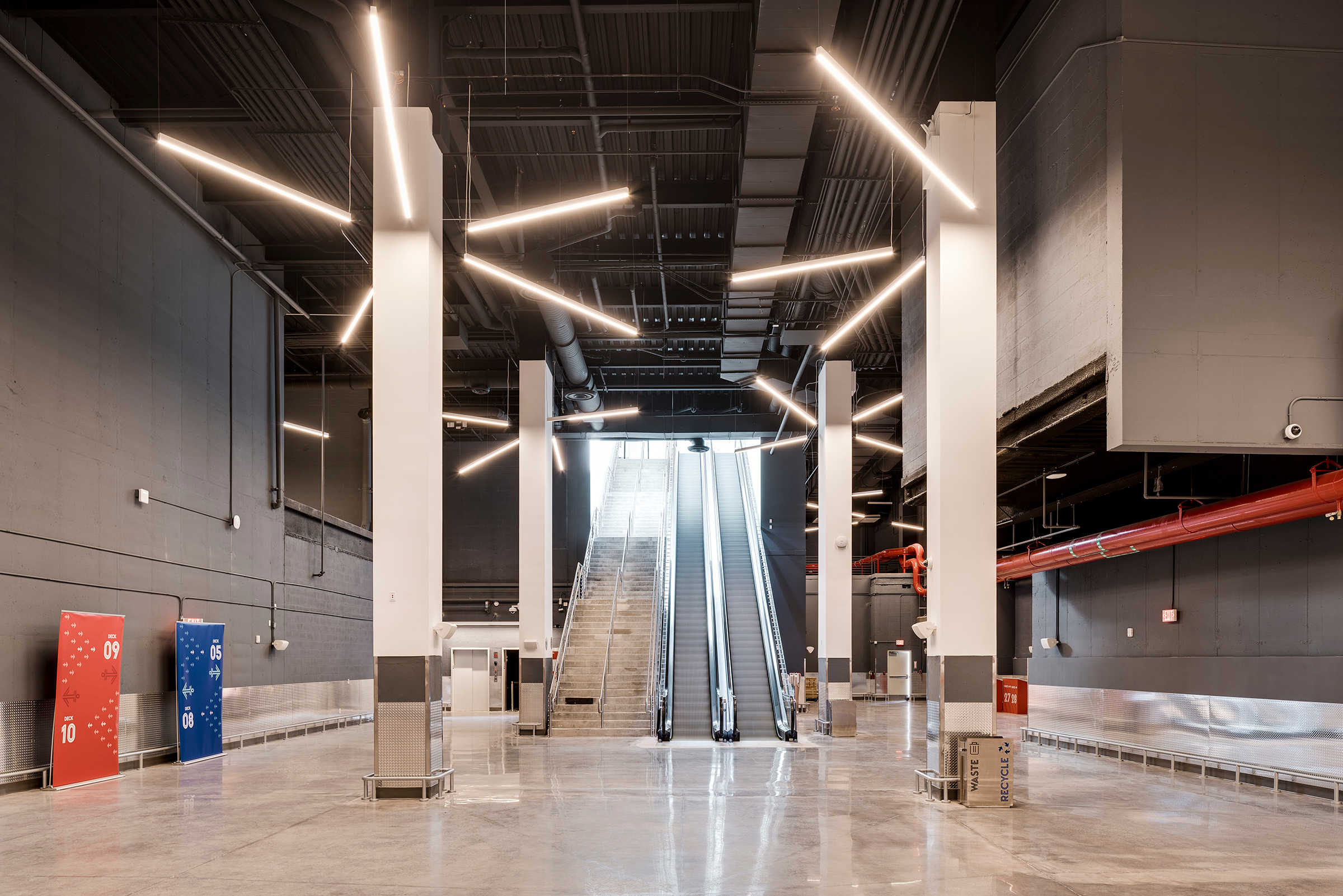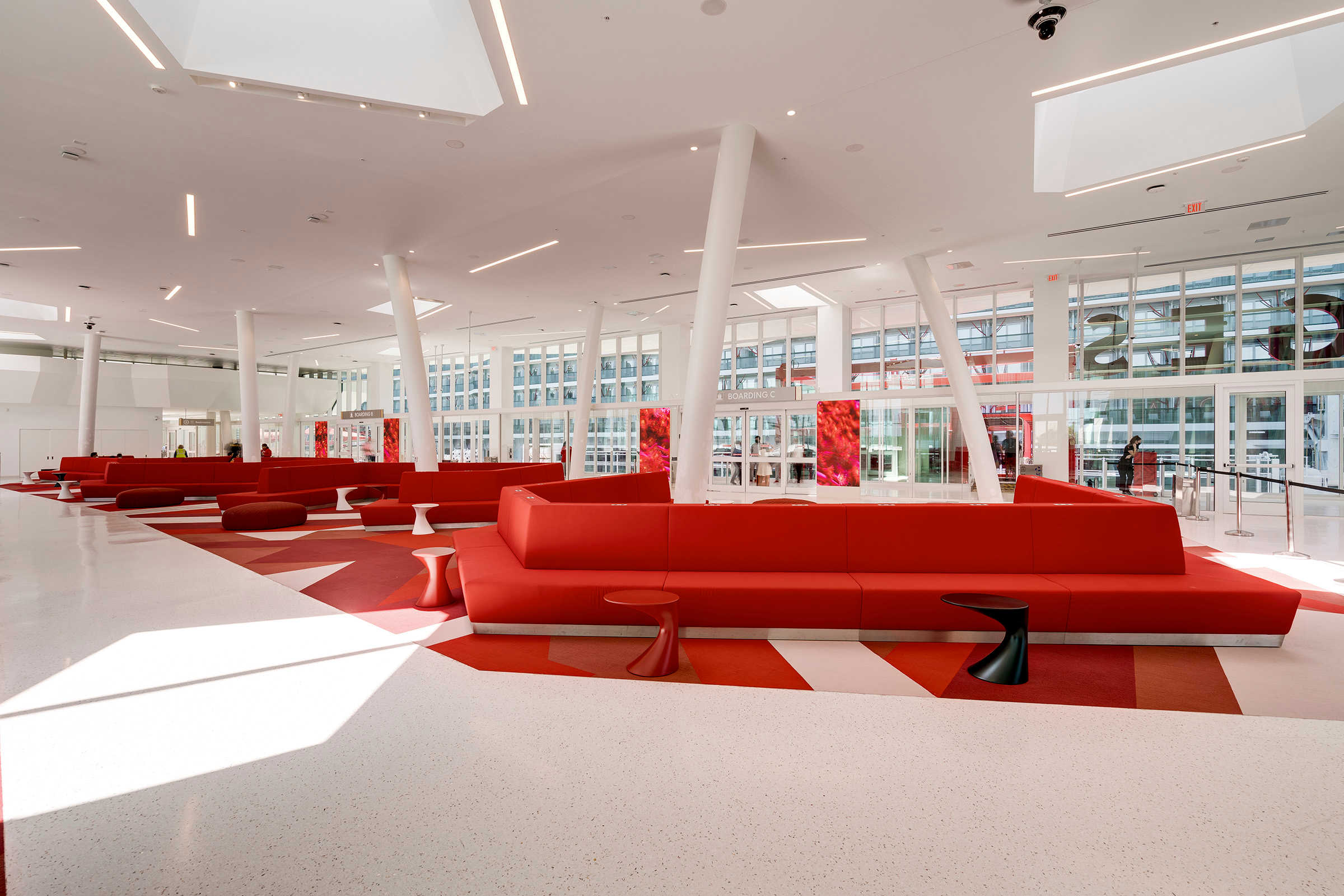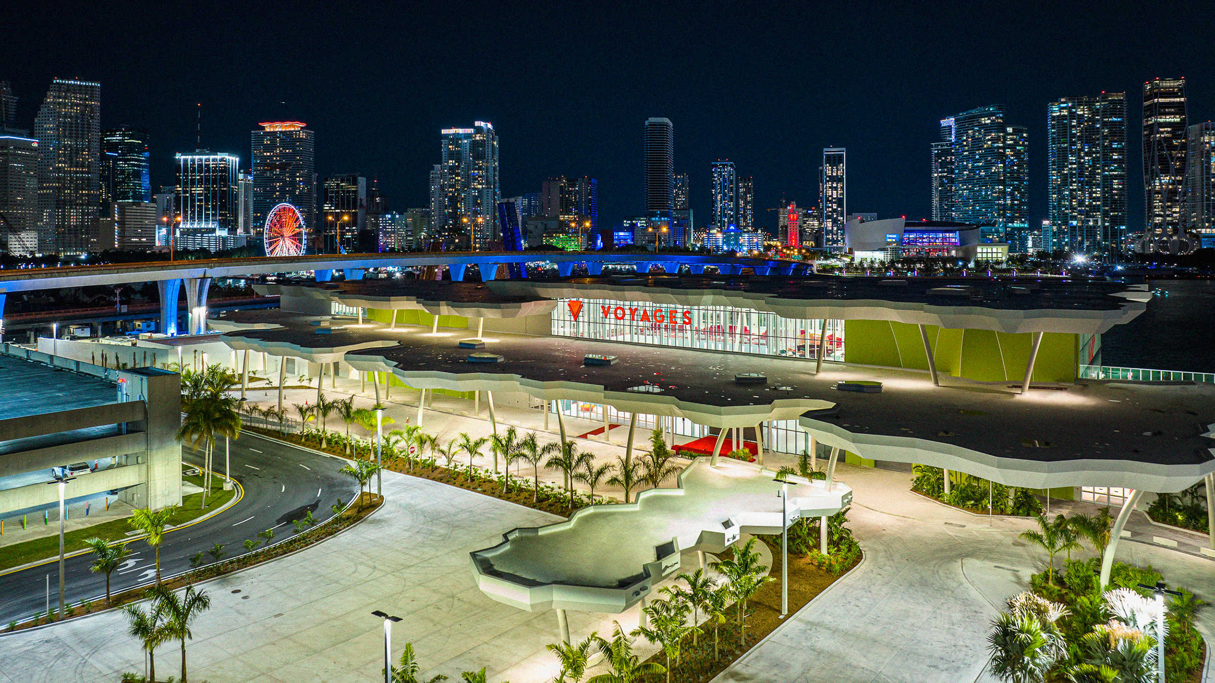 Travelers begin their vacation in Port Miami. Designed by Arquitectonica, the white canopy cruise terminal, partially enclosed in glass, is inspired by a grove of palm trees, providing shade and filtering patterned light. Uplighting defines the structure’s slim columns, while interior and exterior spaces are illuminated through integrated fixtures within the canopy’s skylights. The lighting can be activated to celebrate arrivals and departures with a dynamic and colorful lighting sequence.