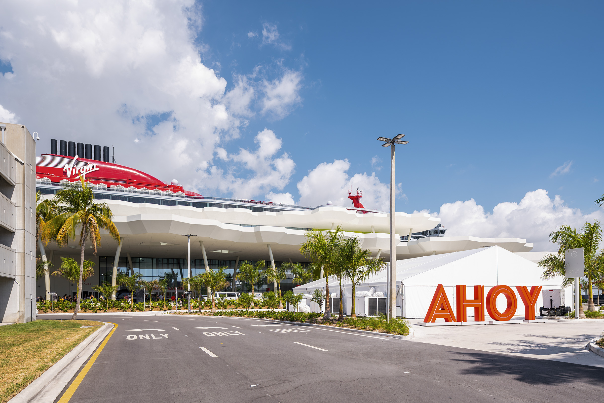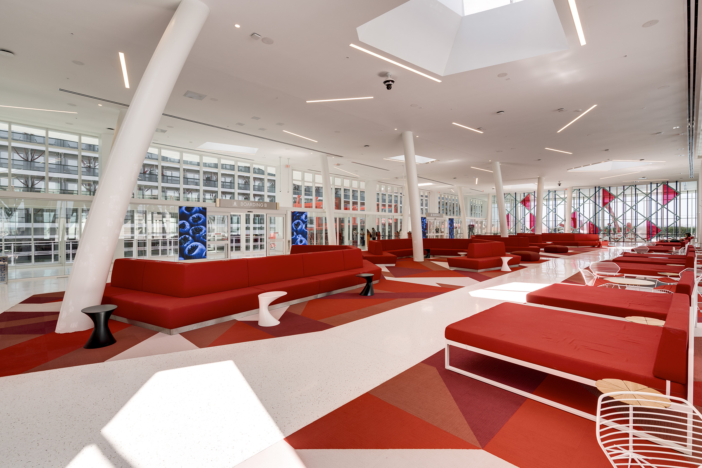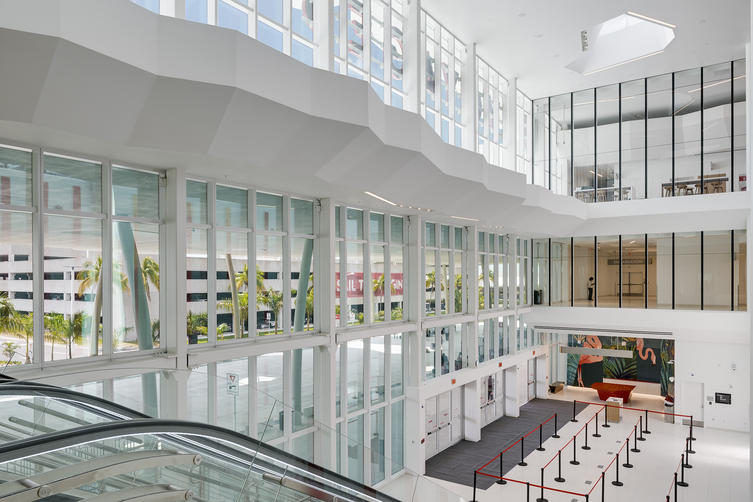Travelers begin their vacation in Port Miami. Designed by Arquitectonica, the white canopy cruise terminal, partially enclosed in glass, is inspired by a grove of palm trees, providing shade and filtering patterned light. Uplighting defines the structure’s slim columns, while interior and exterior spaces are illuminated through integrated fixtures within the canopy’s skylights. The lighting can be activated to celebrate arrivals and departures with a dynamic and colorful lighting sequence.