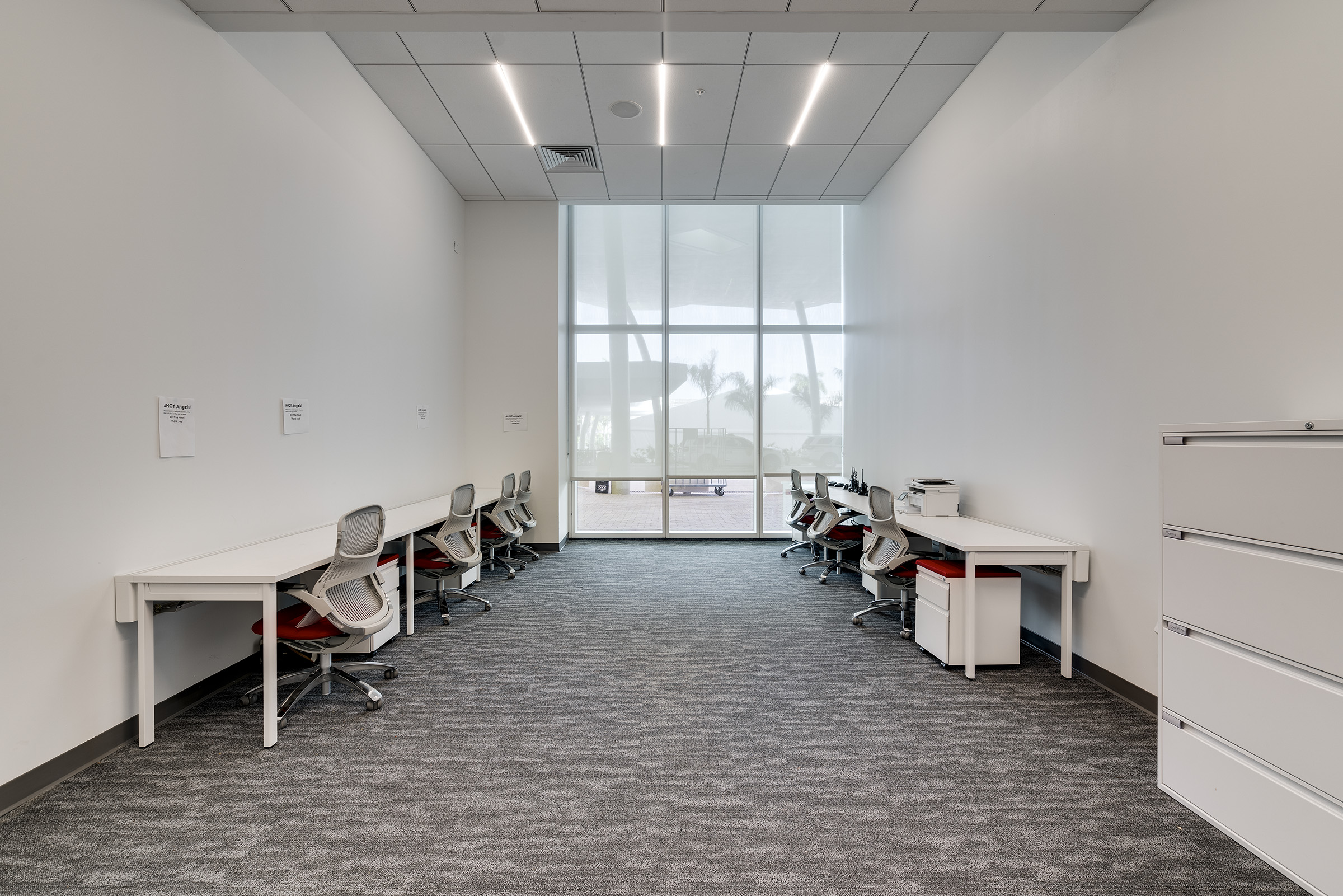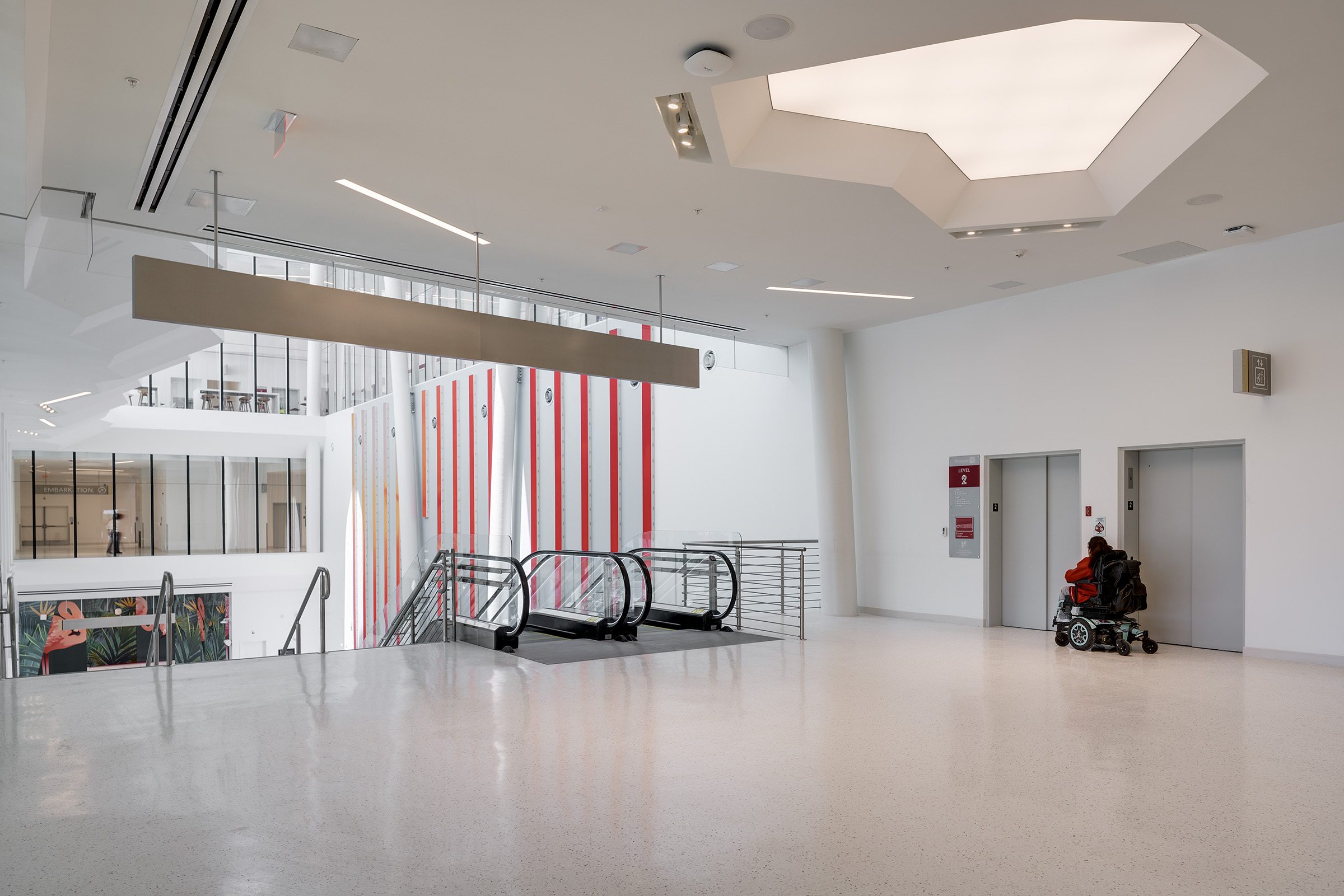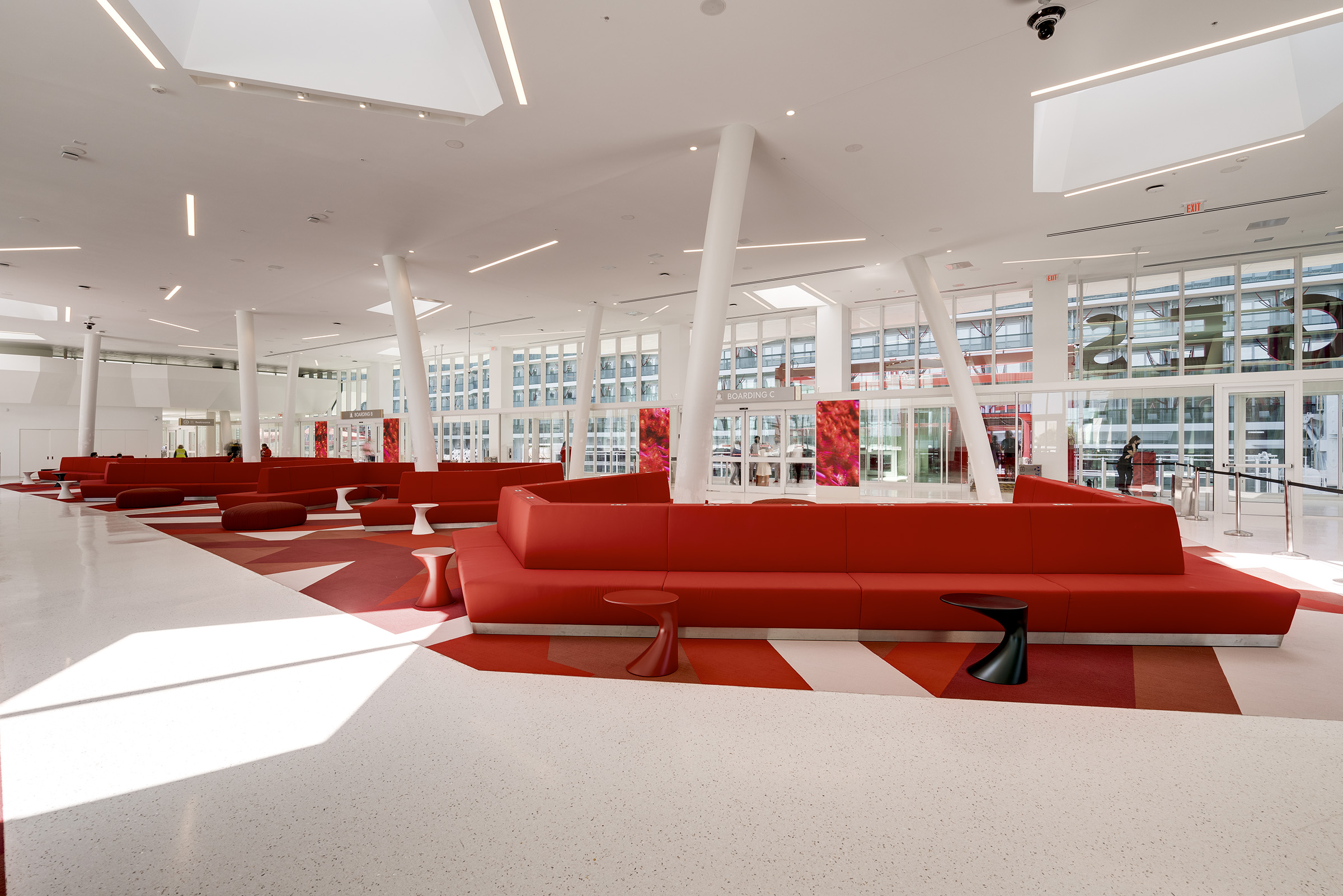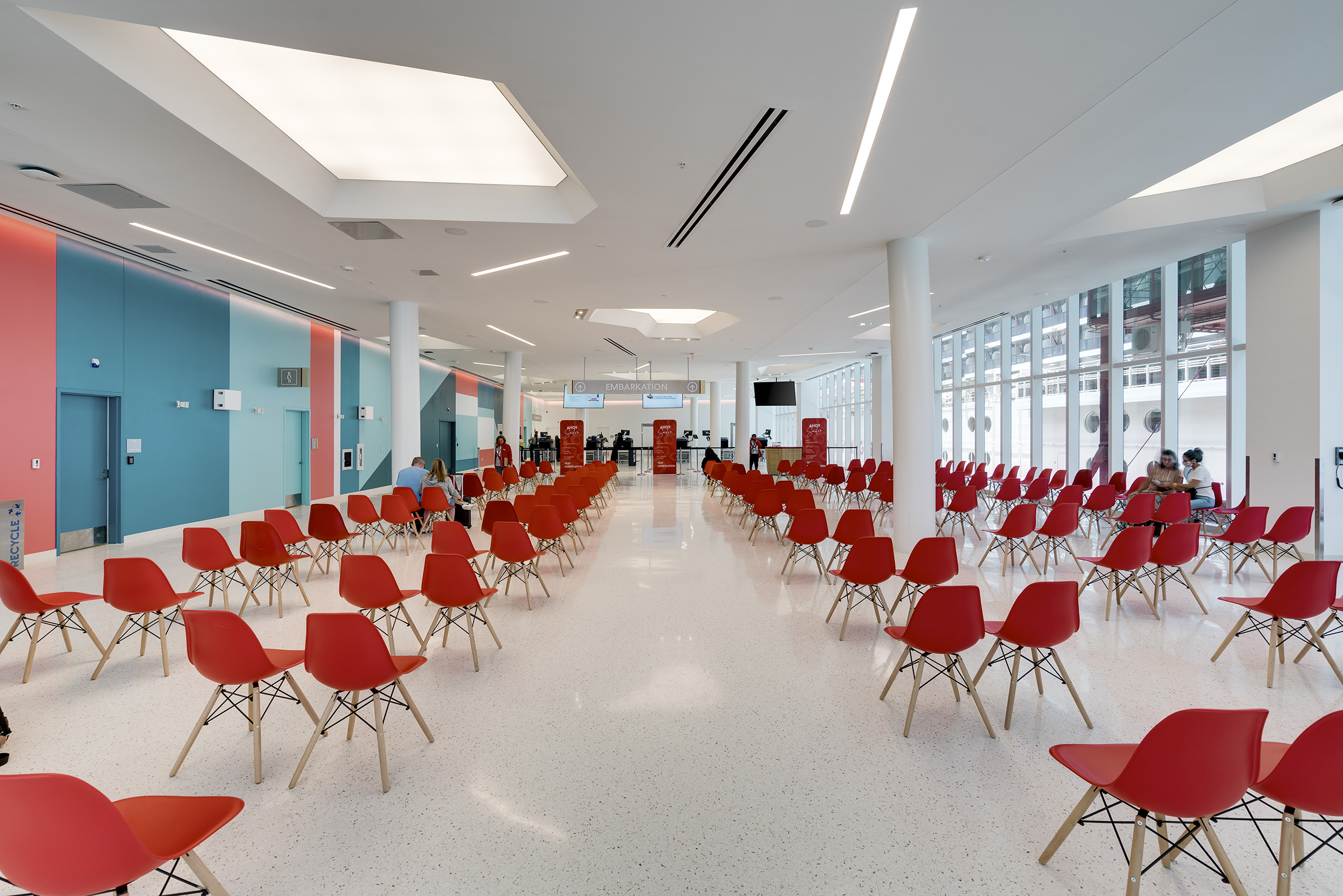 Travelers begin their vacation in Port Miami. Designed by Arquitectonica, the white canopy cruise terminal, partially enclosed in glass, is inspired by a grove of palm trees, providing shade and filtering patterned light. Uplighting defines the structure’s slim columns, while interior and exterior spaces are illuminated through integrated fixtures within the canopy’s skylights. The lighting can be activated to celebrate arrivals and departures with a dynamic and colorful lighting sequence.