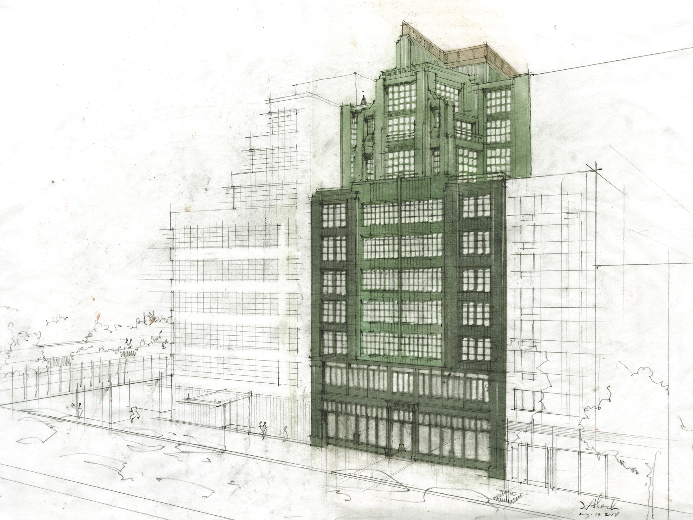 The Fitzroy is a 10 story, luxury condominium tower with fourteen 2- to 5- bedroom units. Harking back to a bygone era, the façade is clad in green terra cotta with custom oak windows clad in copper. The theme is carried through into the interiors with soaring ceilings and chevron wood floors, and marble and copper bathrooms with custom copper soaking tubs.