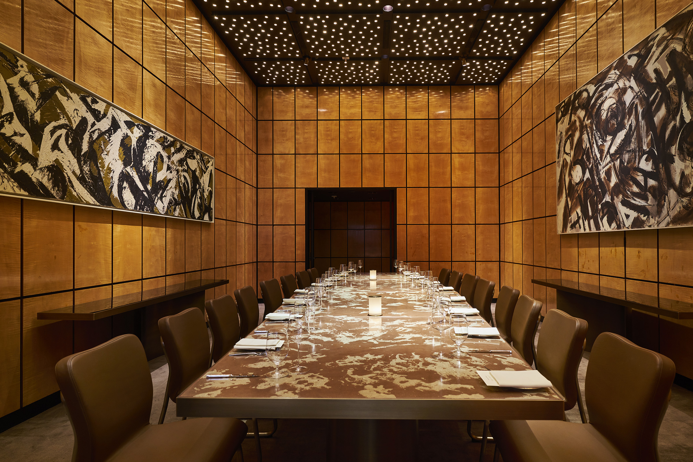 Hervé Descottes, Principal of L'Observatoire International, enhances the intimacy of the dining experience by creating resonance between darker and brighter areas, highlighting table tops and playing with layers of light and shadow at The Grill, while keeping the original lighting scheme.