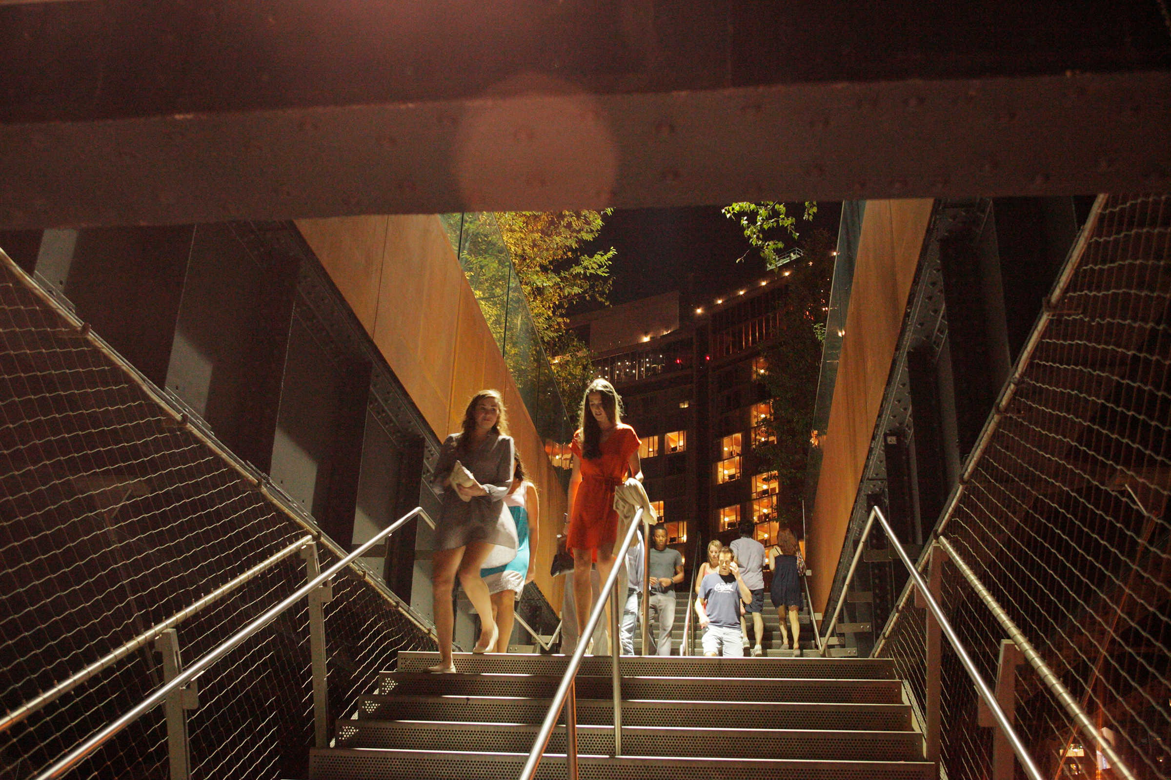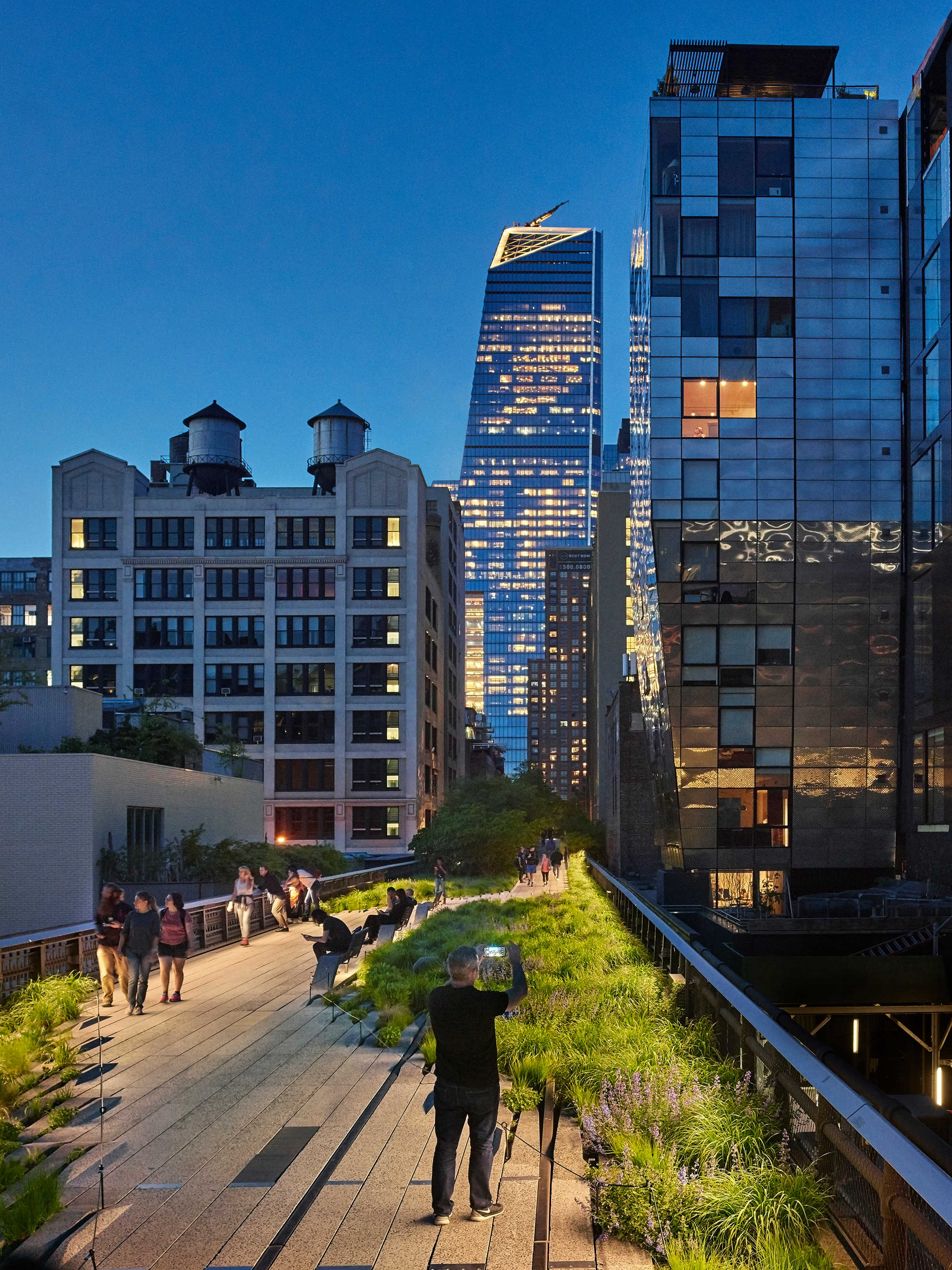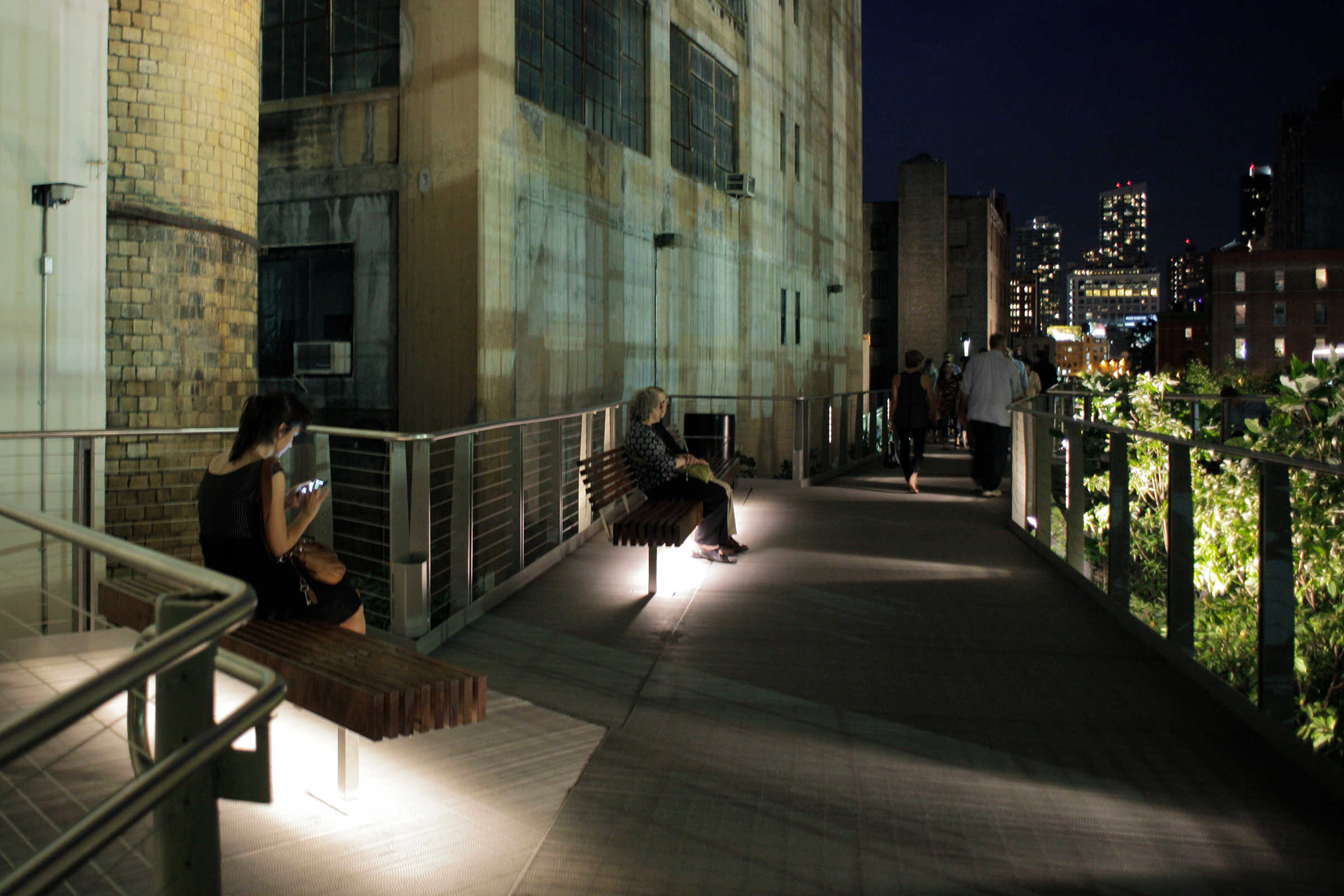 The overall lighting strategy is a consistent low-level plane of light along the perimeter, lifting and floating the High Line above the city below. This soft light marks the edge and silhouettes the High Line for viewers from the street, while creating a unique night walk experience along the highline itself. All light sources were kept at or below eye level, thereby avoiding any glare or obstruction of the night sky and the vistas all around, and keeping the High Line safe, visible, and unobtrusive at night.