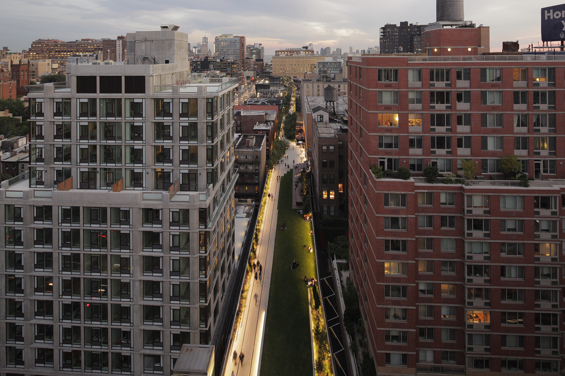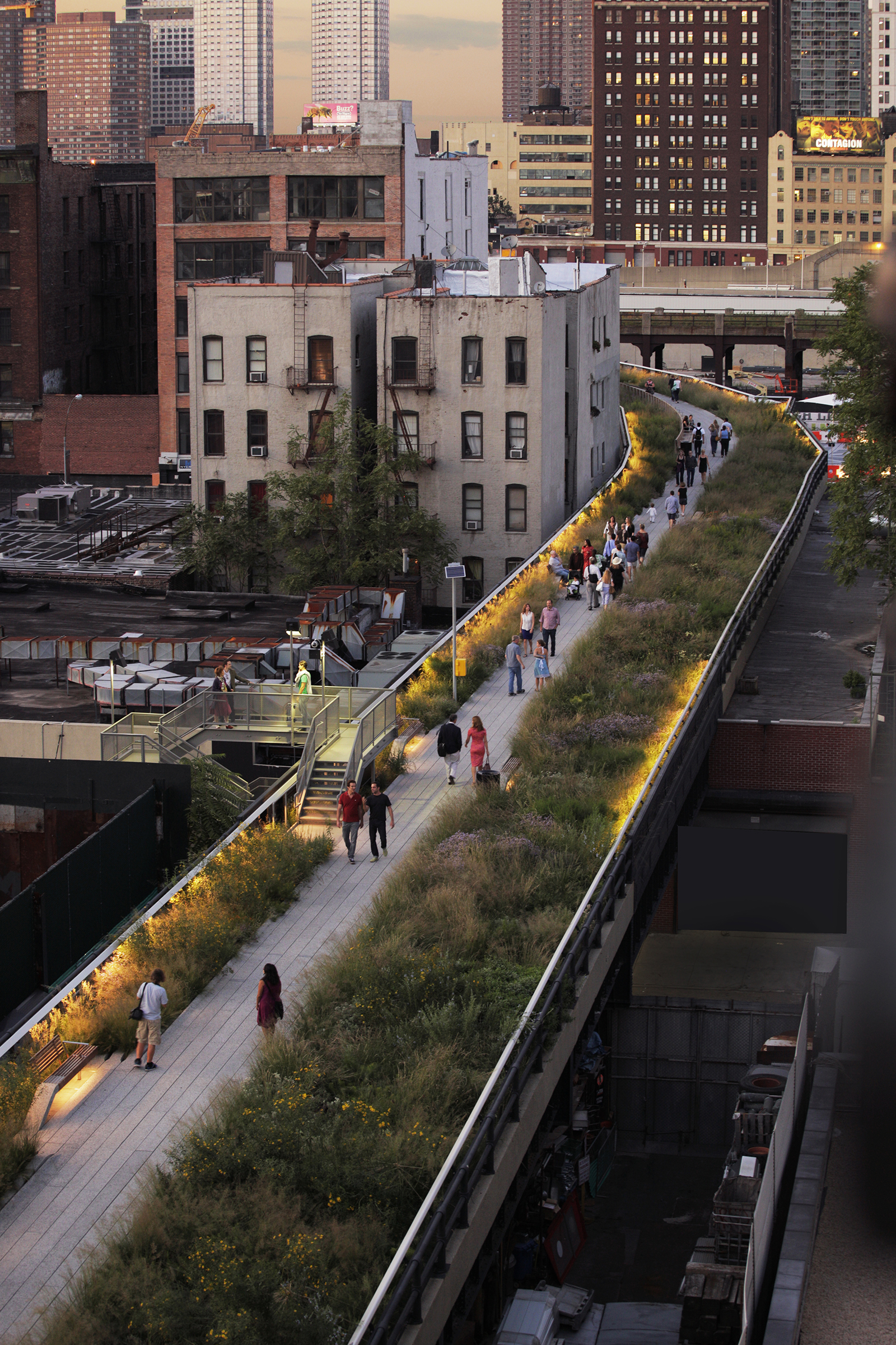 The soft light marks the edge and silhouettes the High Line for viewers from the street, while creating a unique night walk experience along the highline itself