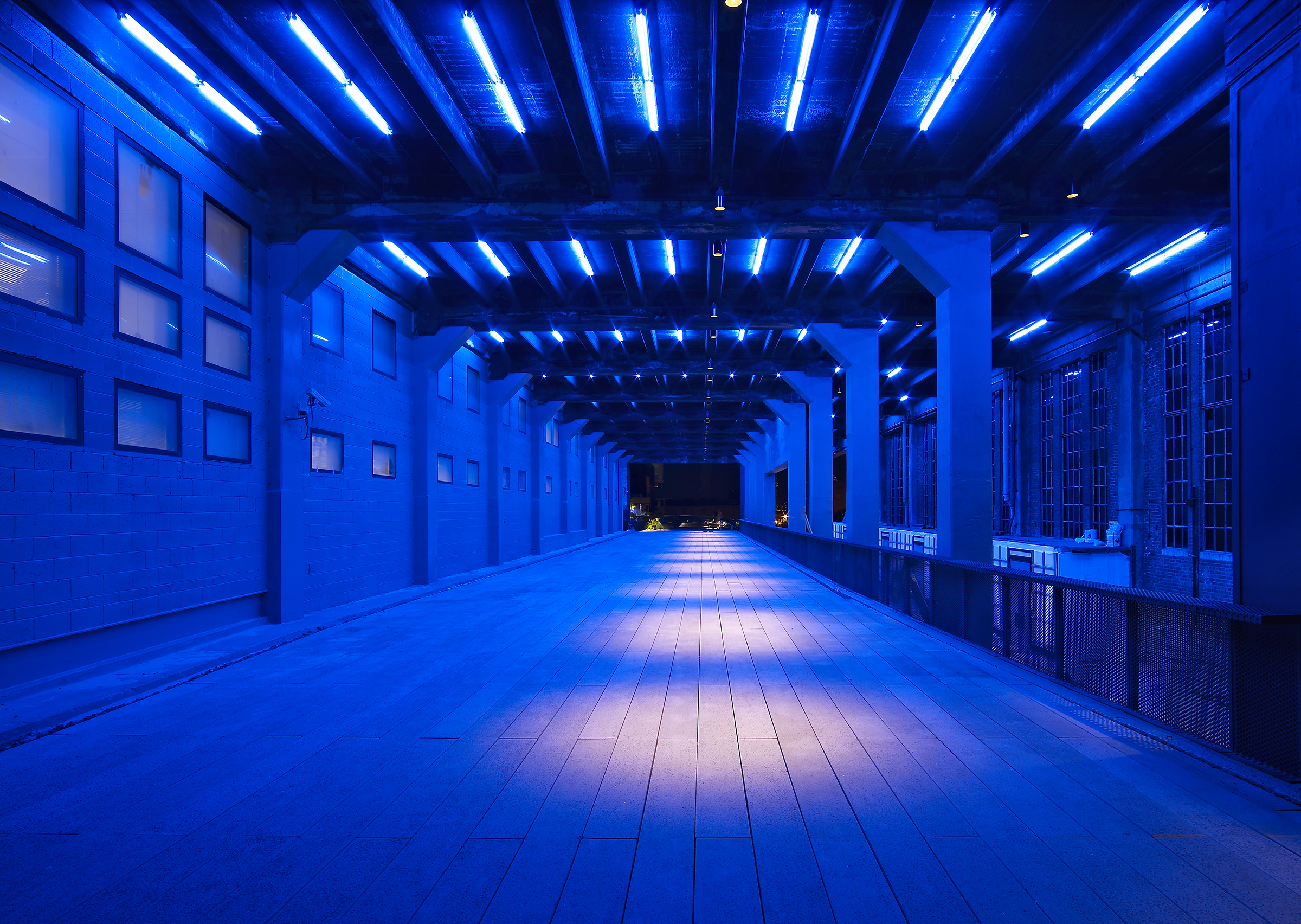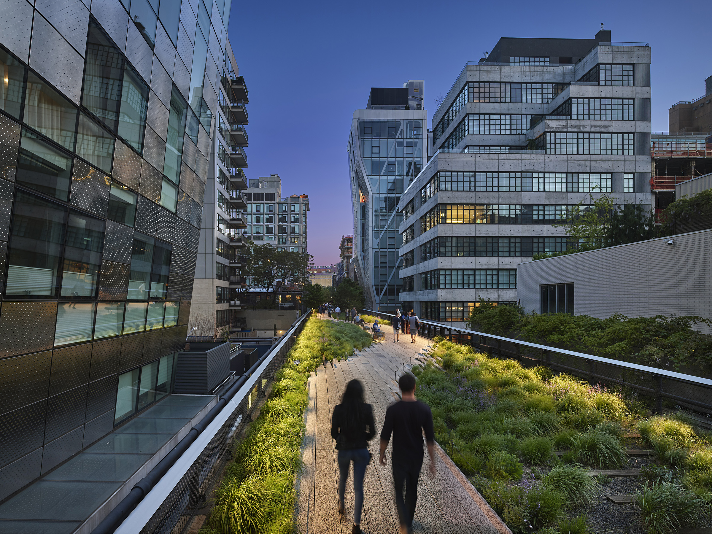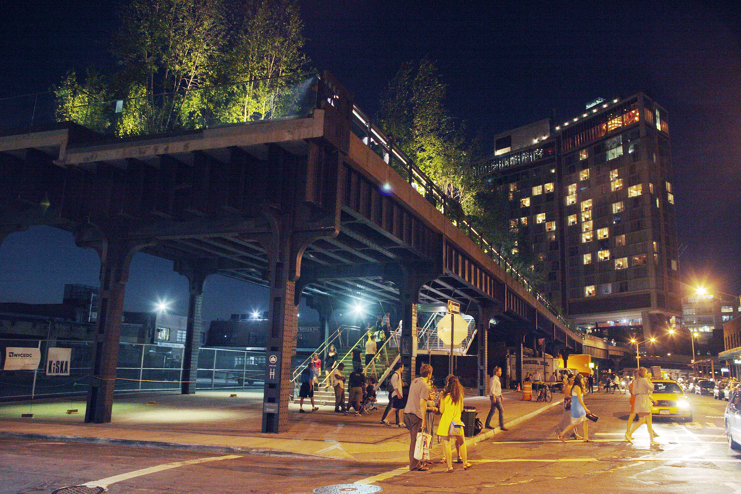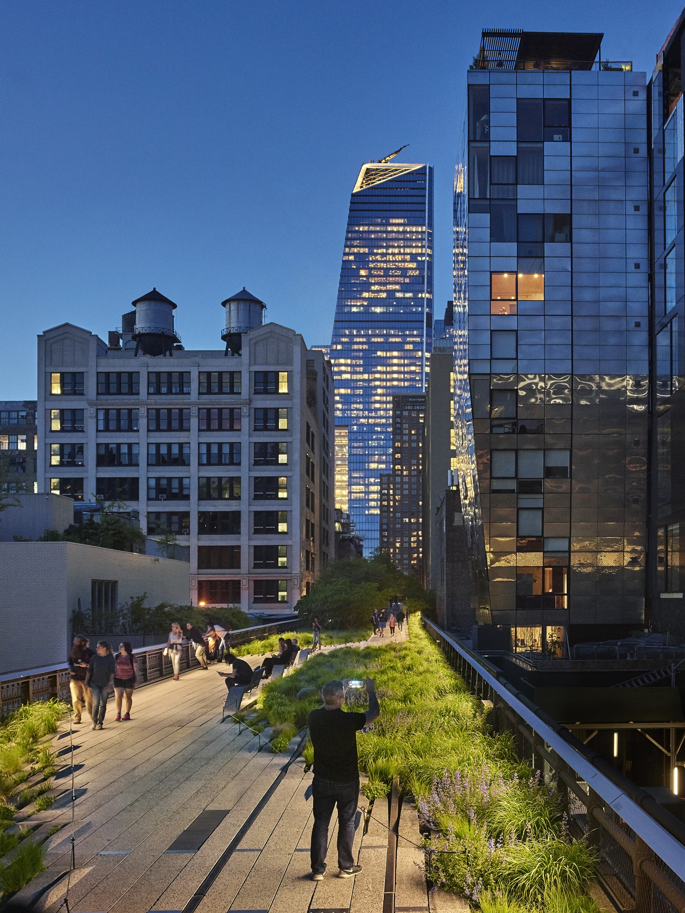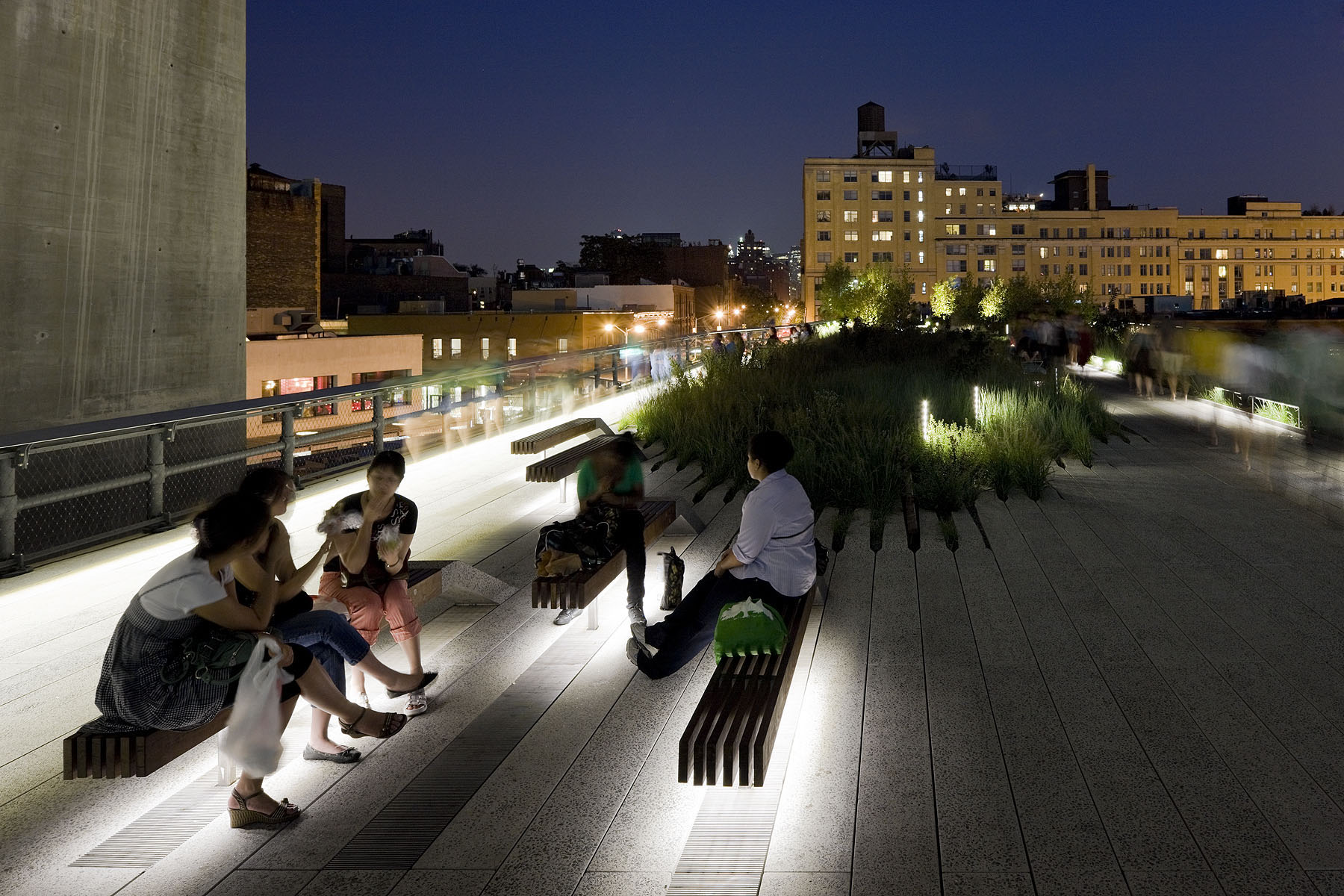 The overall lighting strategy is a consistent low-level plane of light along the perimeter, lifting and floating the High Line above the city below. This soft light marks the edge and silhouettes the High Line for viewers from the street, while creating a unique night walk experience along the highline itself. All light sources were kept at or below eye level, thereby avoiding any glare or obstruction of the night sky and the vistas all around, and keeping the High Line safe, visible, and unobtrusive at night.
