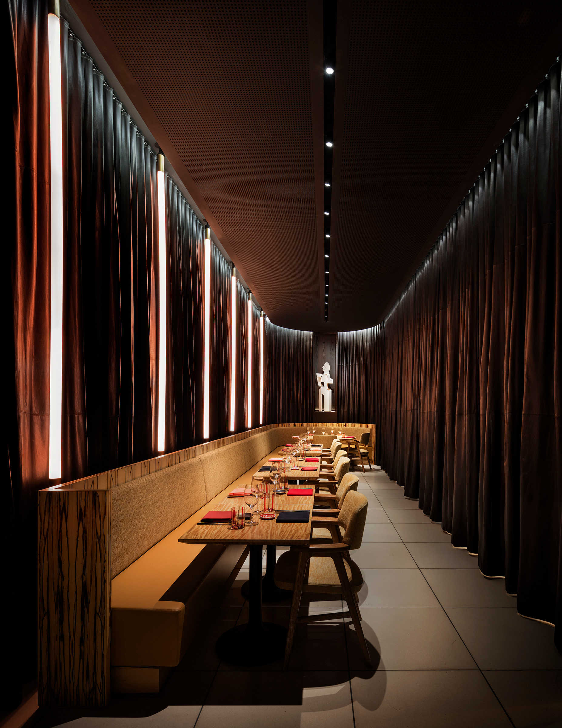 In the lower level space, where there is no natural light to lend a sense of time, the L’Observatoire’s design shapes a theatrical narrative as the day progresses.