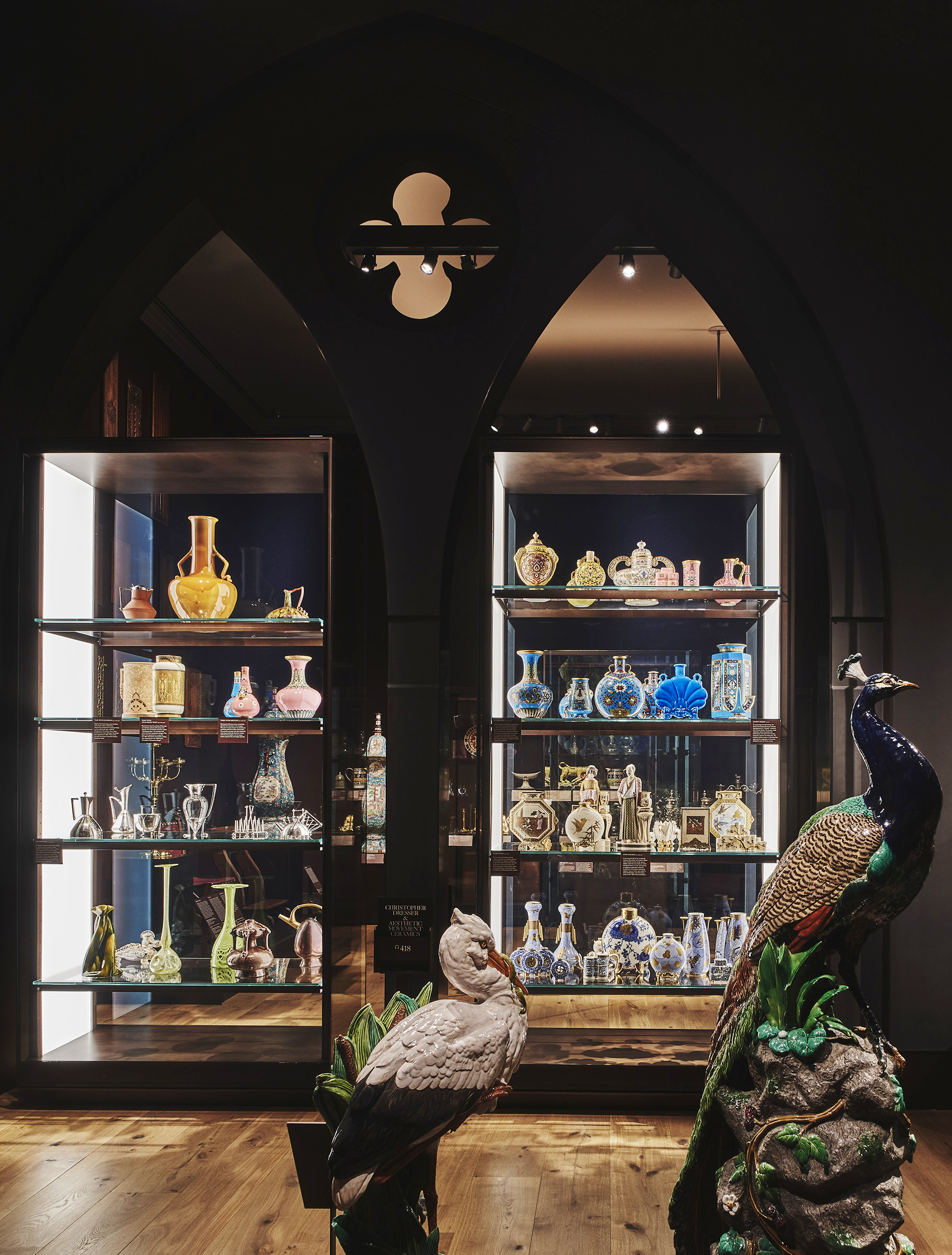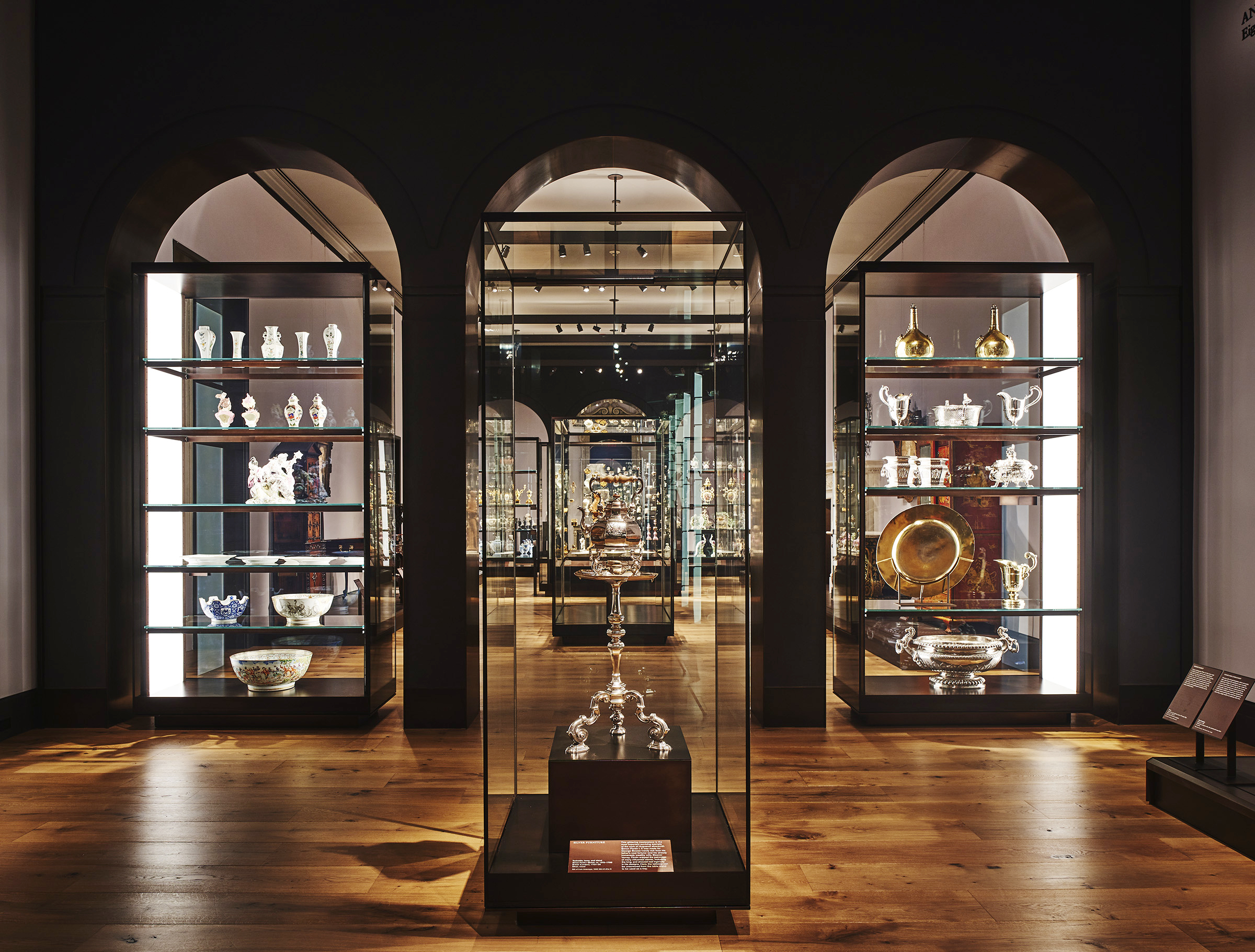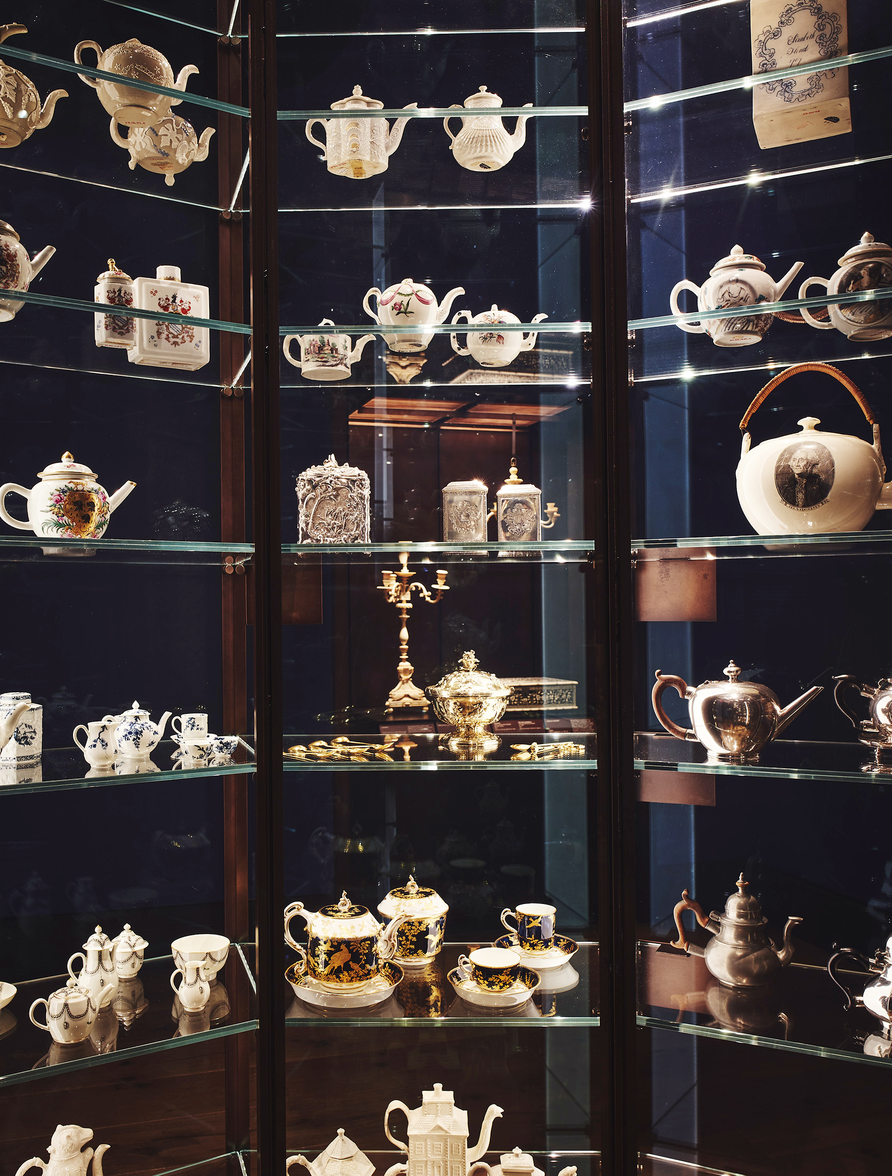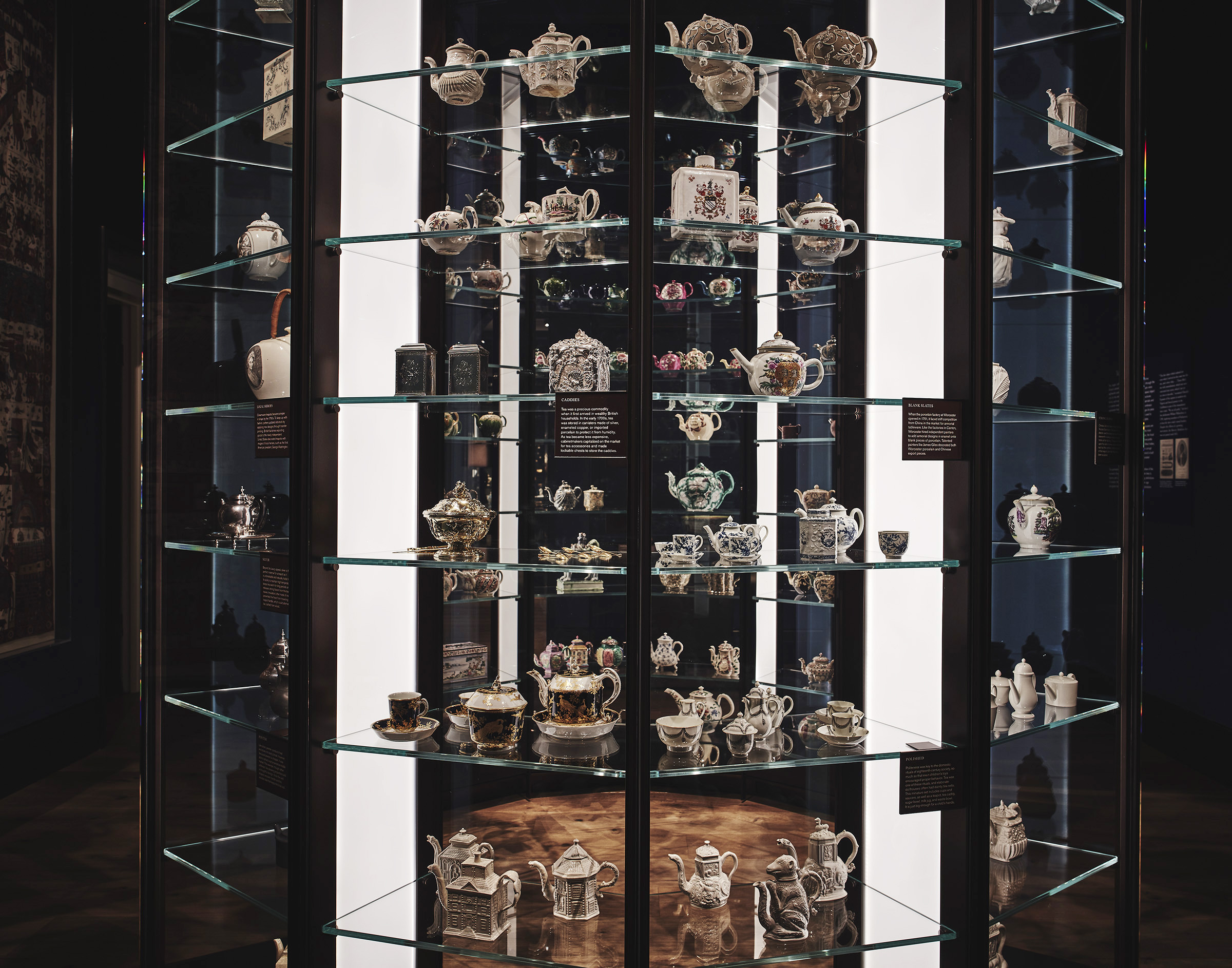 In the “Tea, Trade, and Empire” gallery, which features a selection of a hundred teapots, a customized display case features LED panels integrated into the vertical elements, helping to render the three-dimensionality of the objects. They are simultaneously each illuminated by ceiling-mounted lighting, celebrating the playful patterns of their cast shadows.