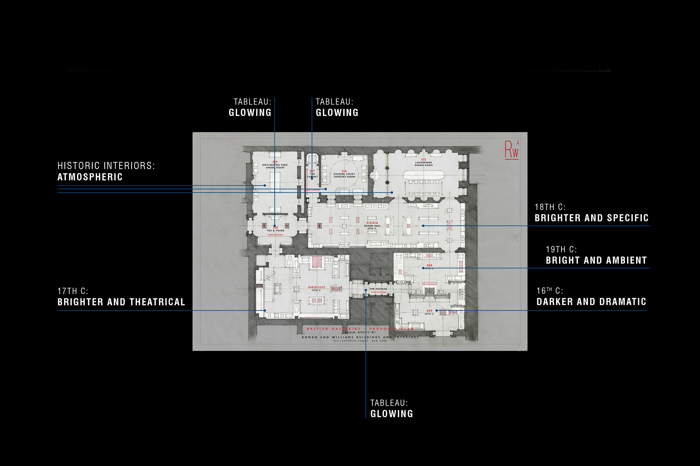 The individual works are lit through accent lighting, while ambient light is provided by uplighting. Throughout the galleries, ceiling-mounted rigs are used as a structure for track heads to provide accent lighting, allowing flexibility and cross lighting without casting sharp shadows. In the eigteenth- and nineteenth-century galleries, the same rigs are also used to provide uplighting.