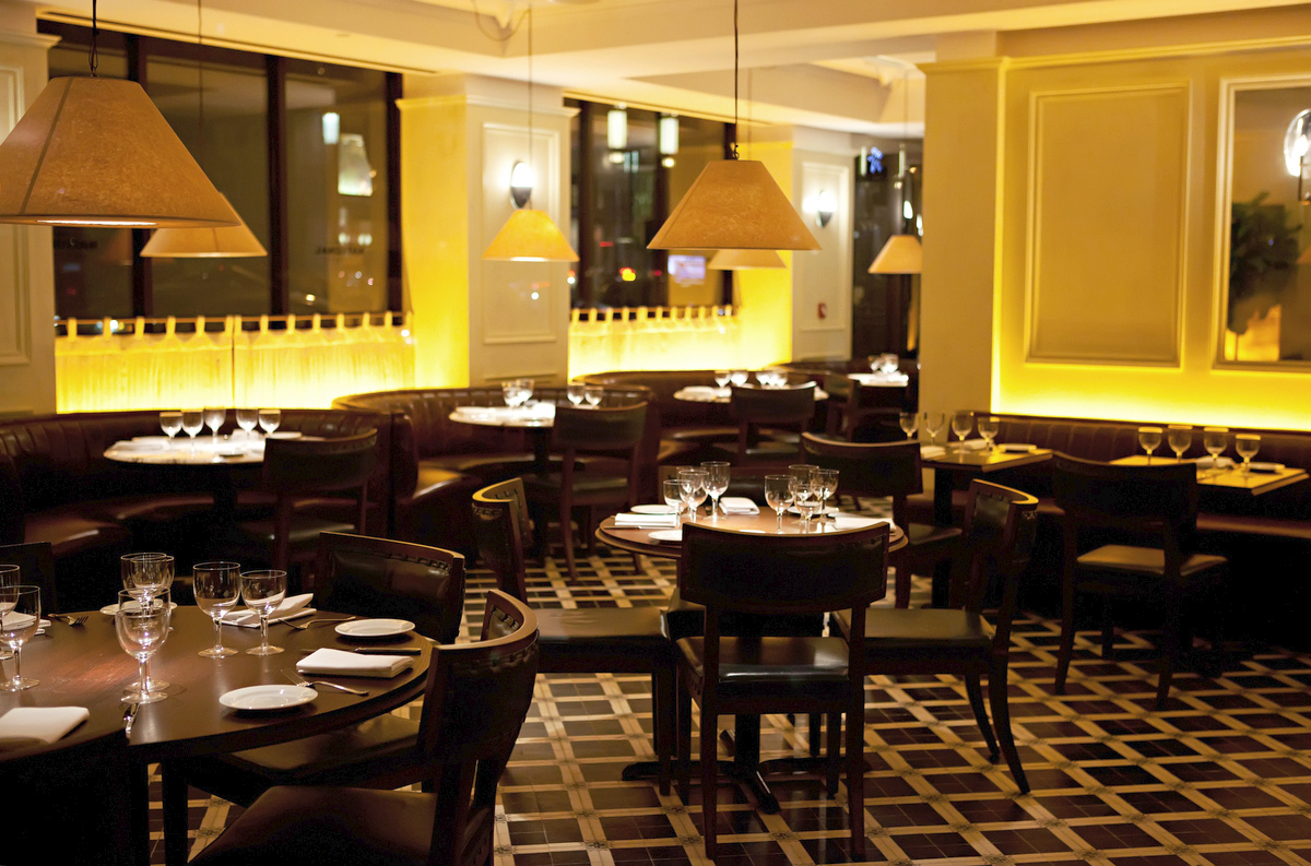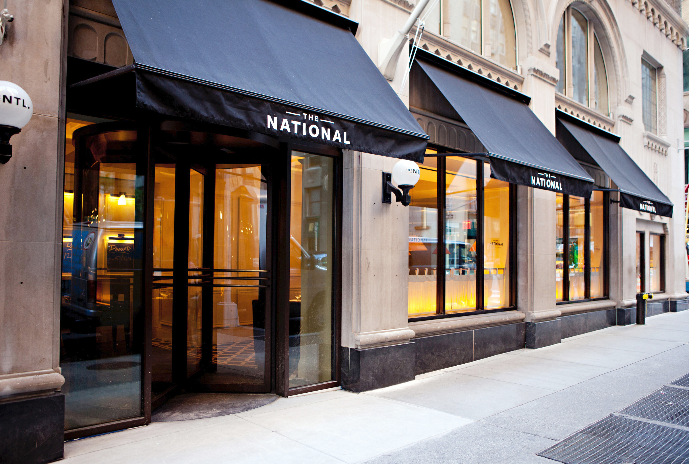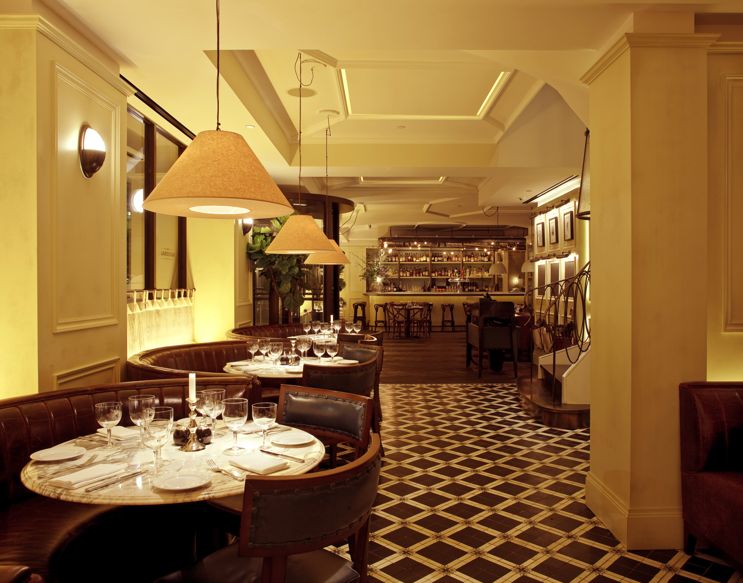 Geoffrey Zakarian’s The National is a modern bistro in bustling midtown New York. A refined space reflective of the grandeur of the Benjamin Hotel that houses it, this signature restaurant celebrates the grand cafés and bistros of London, Paris, and New York. Three distinct spaces—a lounge, dining room, and open kitchen—are unified by luxurious finishes and a vibrant atmosphere. The design emphasizes light and elegance with cream lacquer wood paneling, glazed cement tile floors, and custom blue leather upholstery.