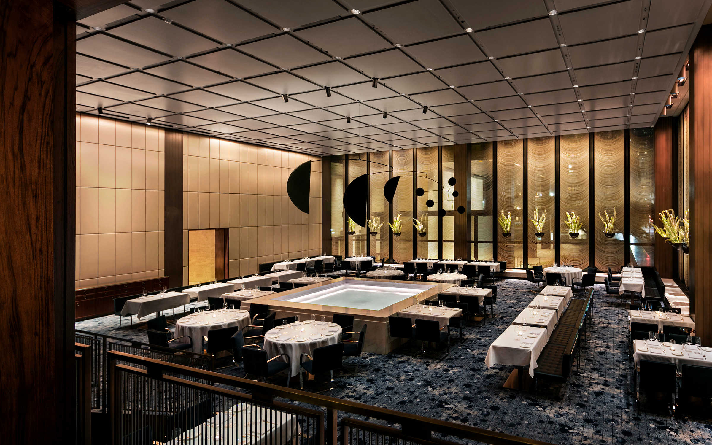 The open, cool, sleek feeling of the interior of The Pool is playfully interrupted by a dynamic tension between fire and water, as candles float in the pool at the room’s center, another beloved artifact of the original space.
