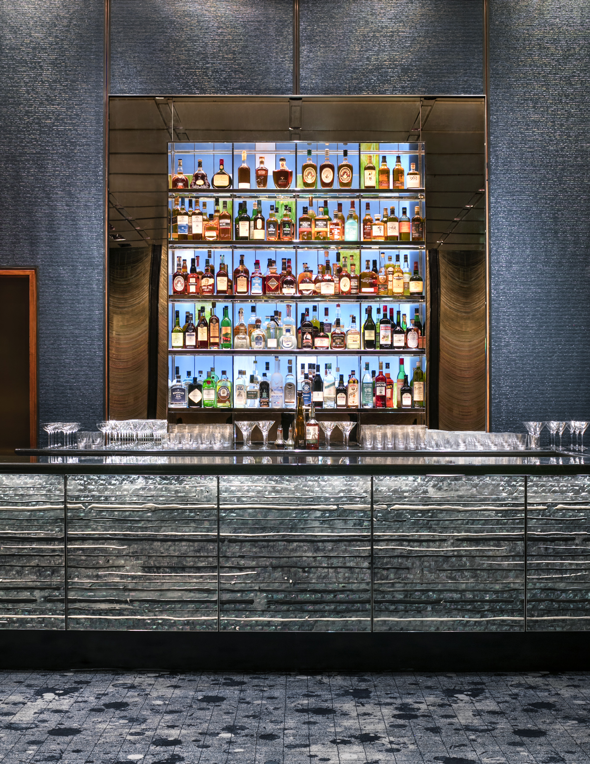 The open, cool, sleek feeling of the interior of The Pool is playfully interrupted by a dynamic tension between fire and water, as candles float in the pool at the room’s center, another beloved artifact of the original space.