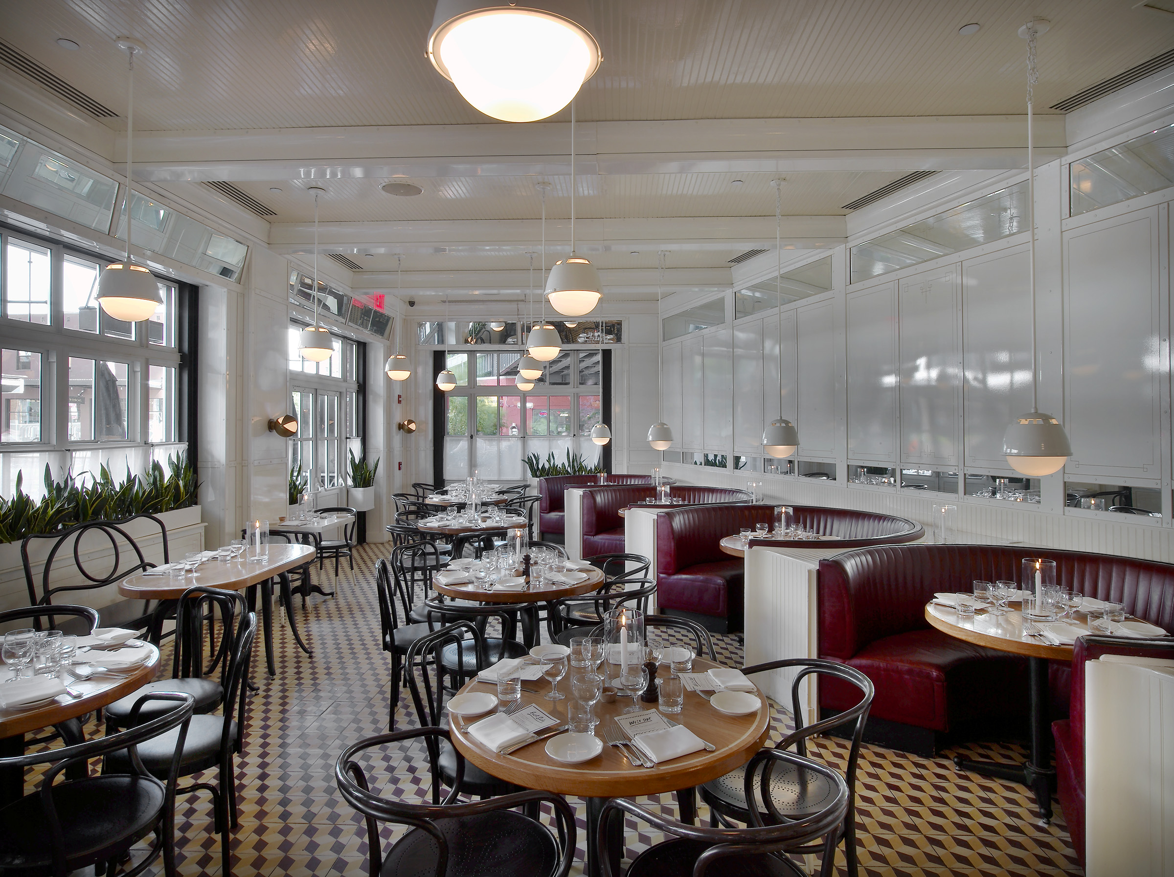 By contrast to the Brutalist concrete form of the Standard Highline building that rises eighteen stories above the High Line, the new restaurant, which is set beneath the High Line’s trellis, was designed in brick by Roman and Williams to respond to the context and history of its neighborhood.