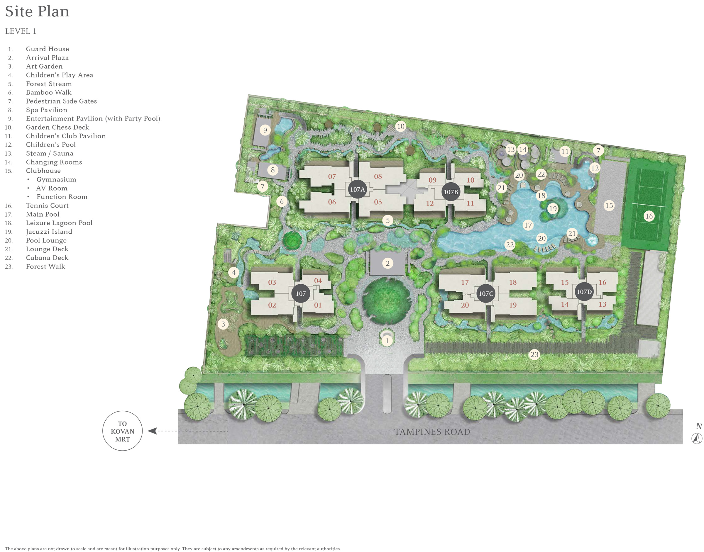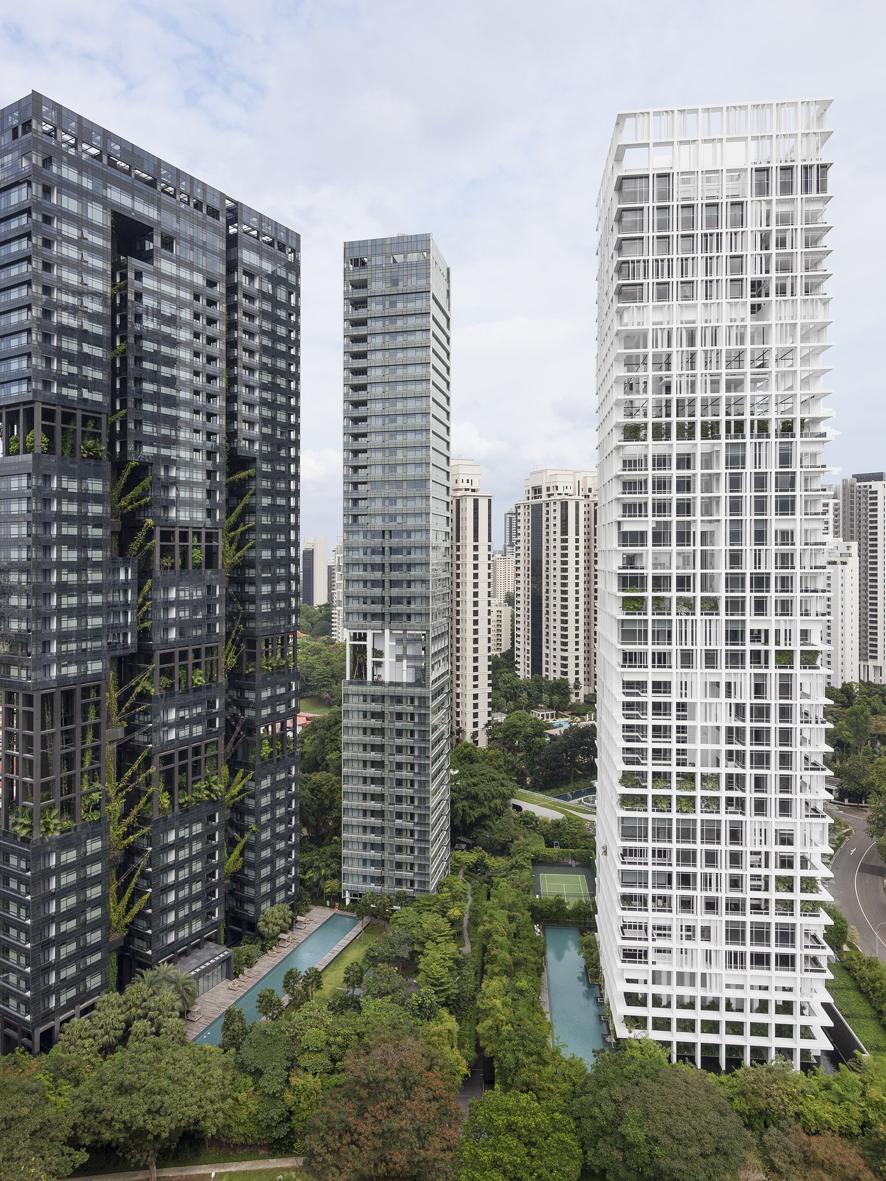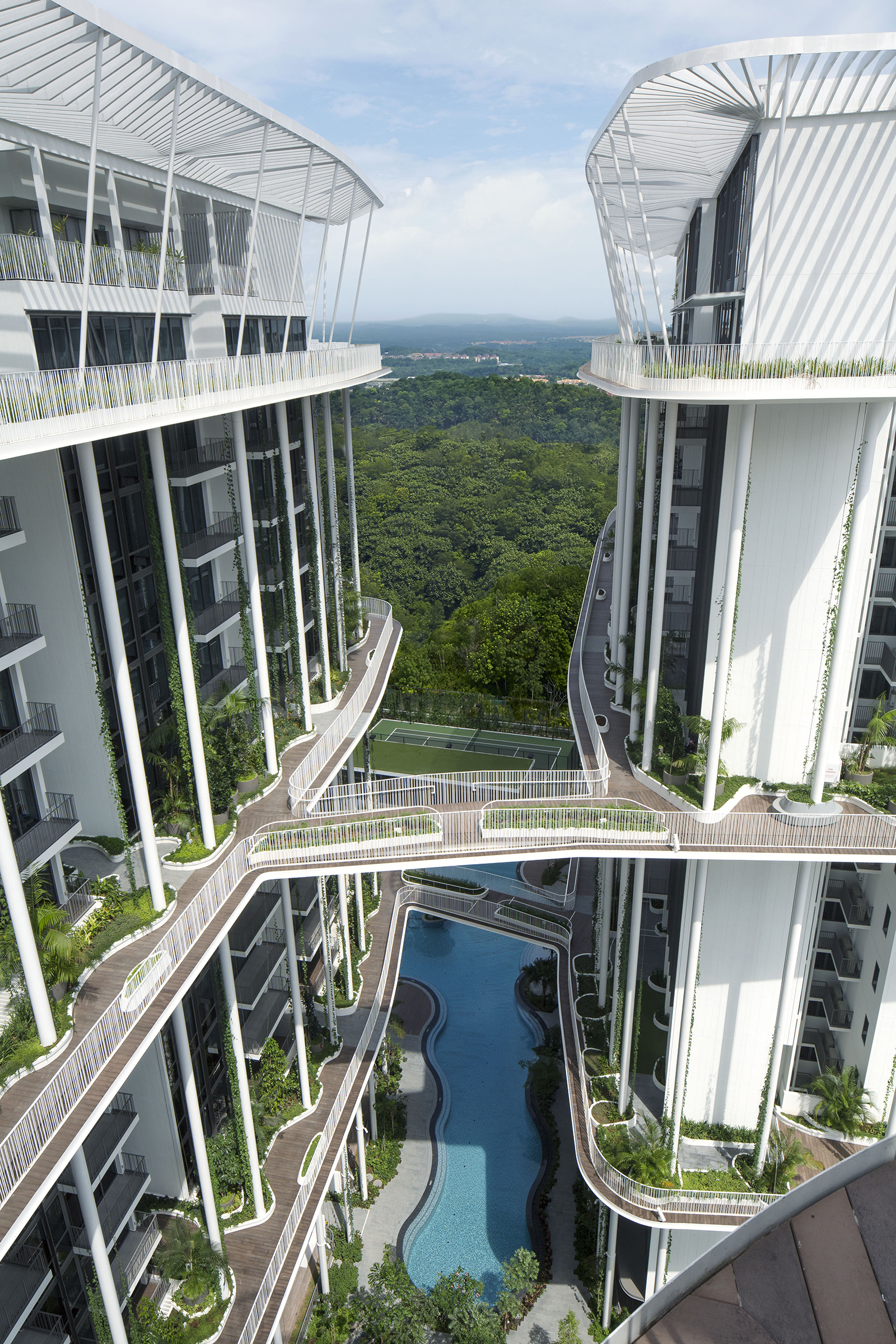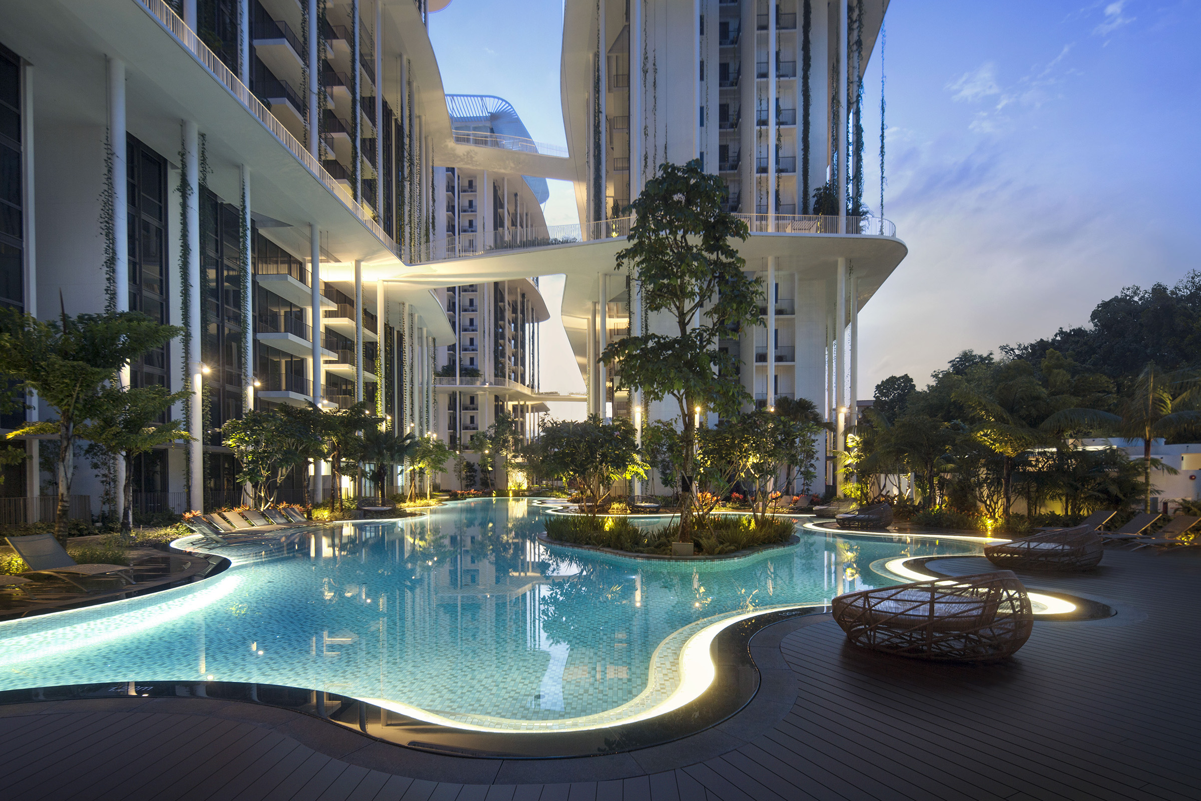 The Tembusu is a residential condominium in Singapore that comes with unique architectural and landscape features. One of its features is that the delicate threads of nature around the columns interweave with the architecture to create an organic, living facade, bringing the landscape closer to the residential units. It also create an impression that the landscape drapes over two sky links, creating an even more intimate experience with nature. The development also complete with interesting water feature that captures and retains the rainwater, which gives rise to meandering streams within the lush landscape. The Tembusu promises a bouquet of luxurious facilities throughout the development, which includes various sizes of pools, thematic pavilions and private clubhouse.