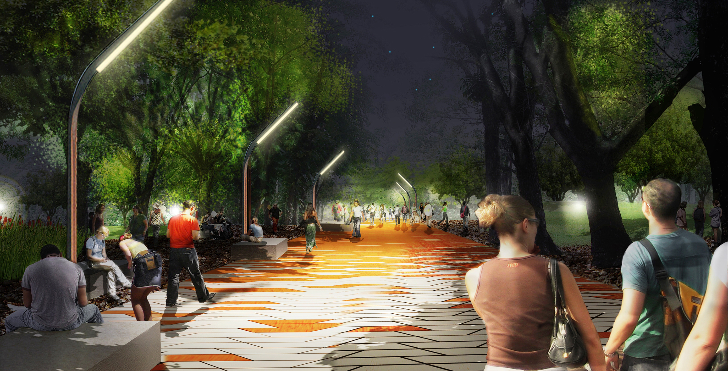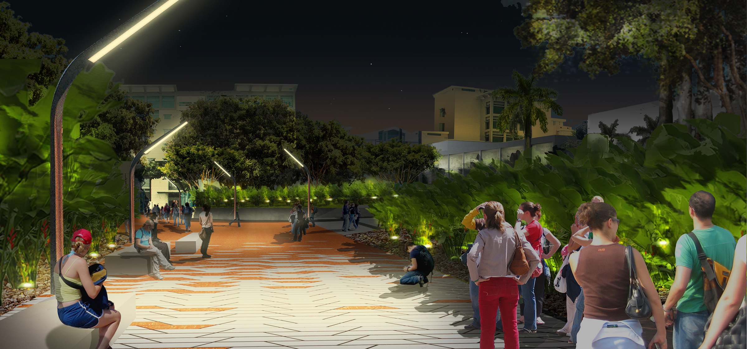 With a variety of readily applicable lighting techniques and equipment, lighting permeates the campus grounds. Nighttime illumination intensifies the properties, textures, and colors of the campus as an environment, while vertical and horizontal massing of primary architectural elements and landscape features create icons in the nightscape.