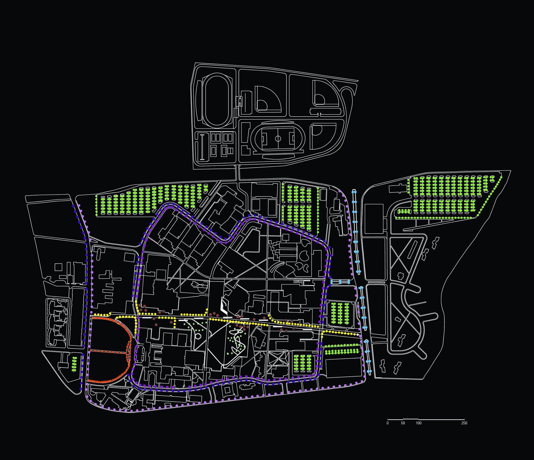 The Lighting Design part of this project consists of four main components: the Campus Walk, which is the main pedestrian artery of the campus, the Loop, which is a new vehicular ring surrounding the campus, the Historic and New Gateways, which are the two main approaches to the campus, and the Edges, which are outlying areas of parking at the periphery.