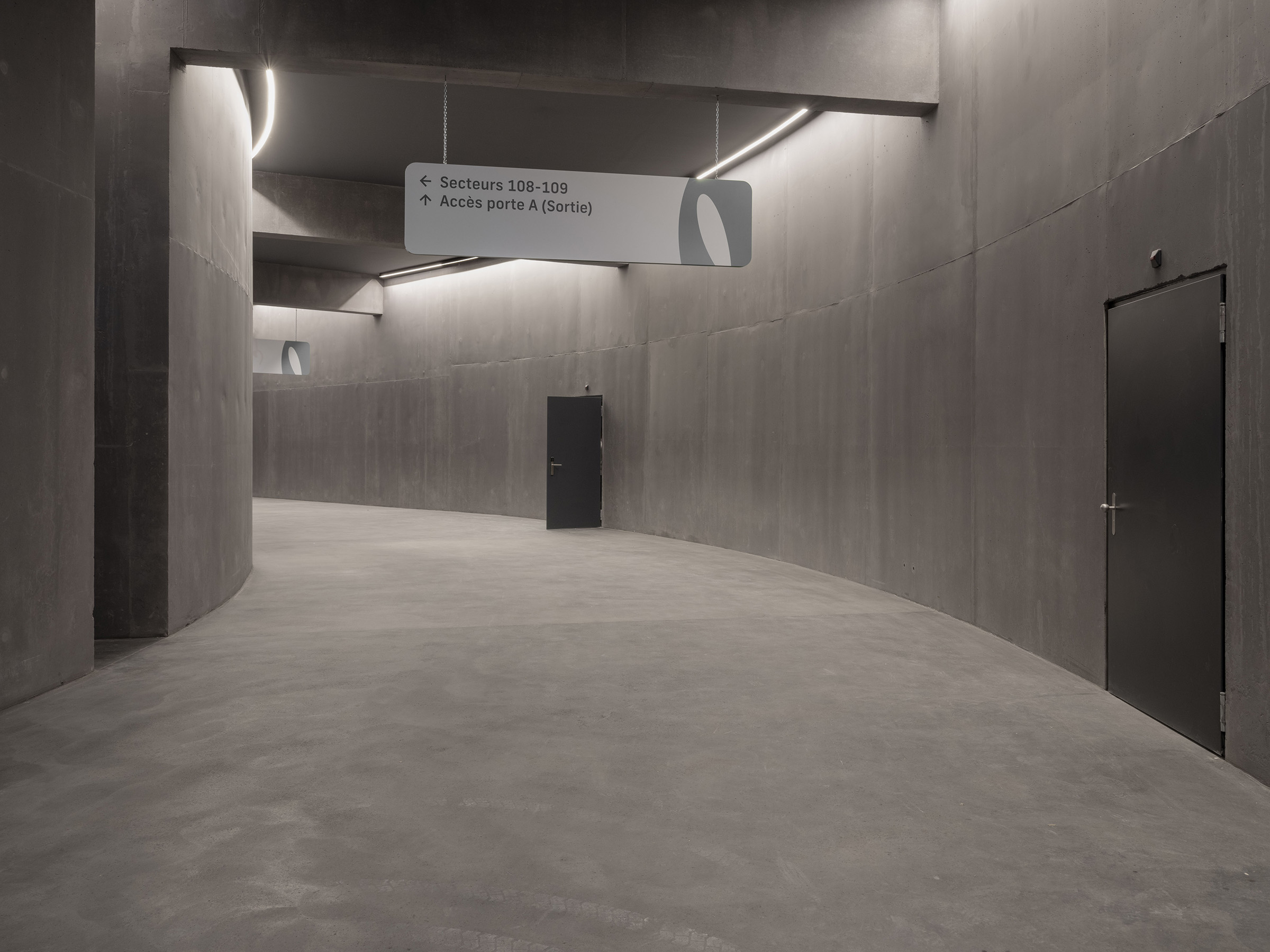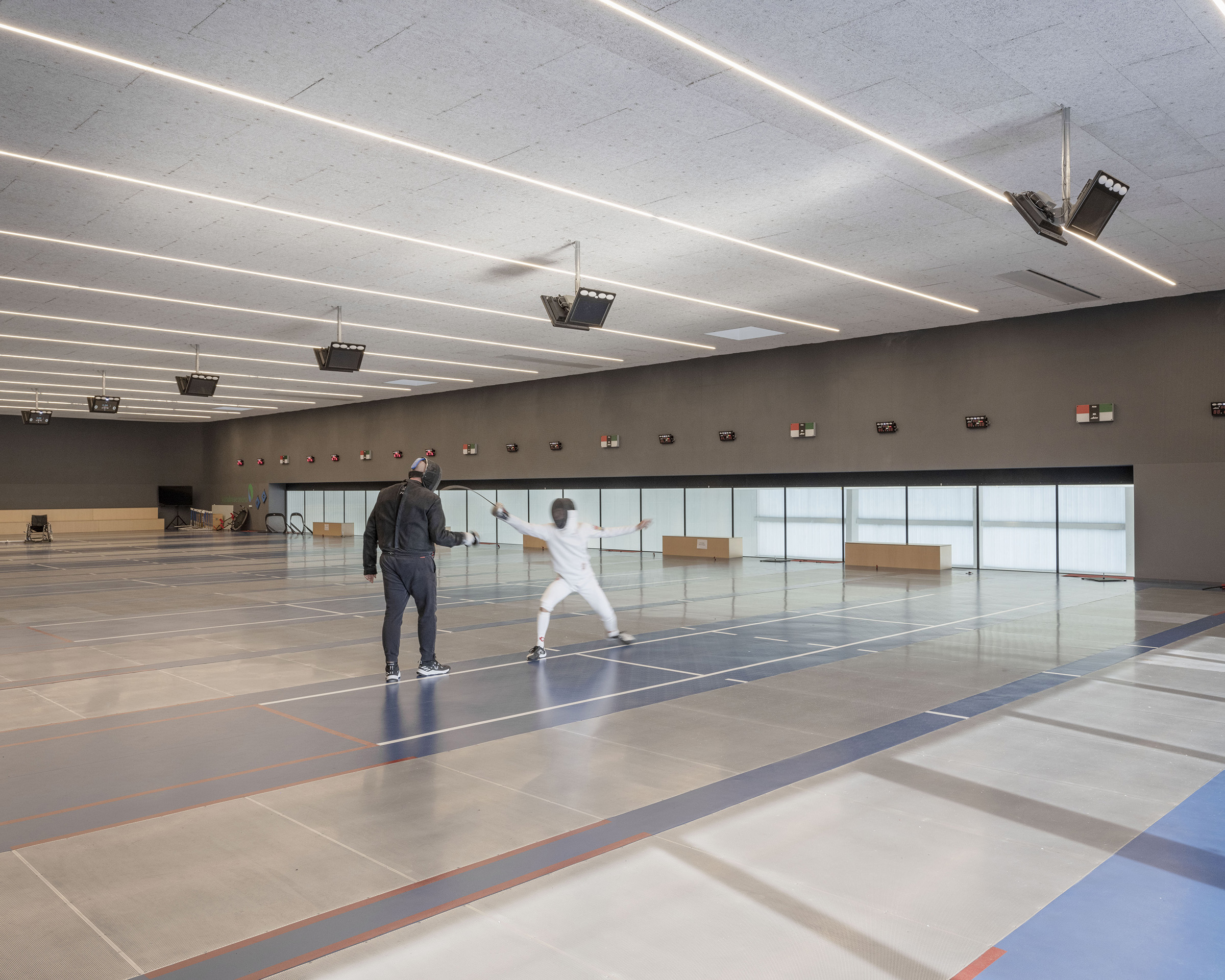 Table tennis and fencing are also illuminated by thin bands of suspended light. All of the lighting in sports spaces meets the latest extremely complex standards in terms of power, light levels (horizontal and vertical) and uniformity. By their disposition, multiplication or spreading of sources, it also seeks to respond to the recurring problem of glare in sports facilities.
