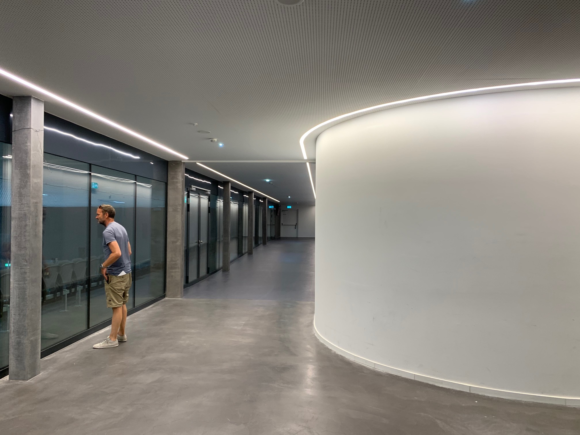 The facade of thick glass panels is backlit, playing between façade and interior lighting