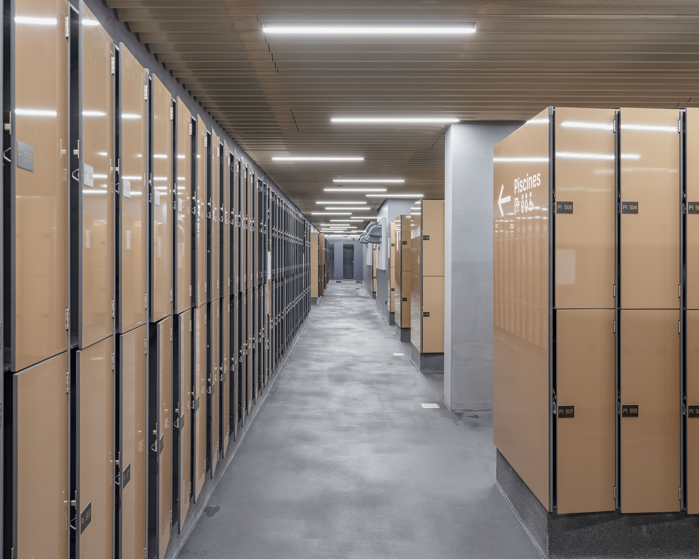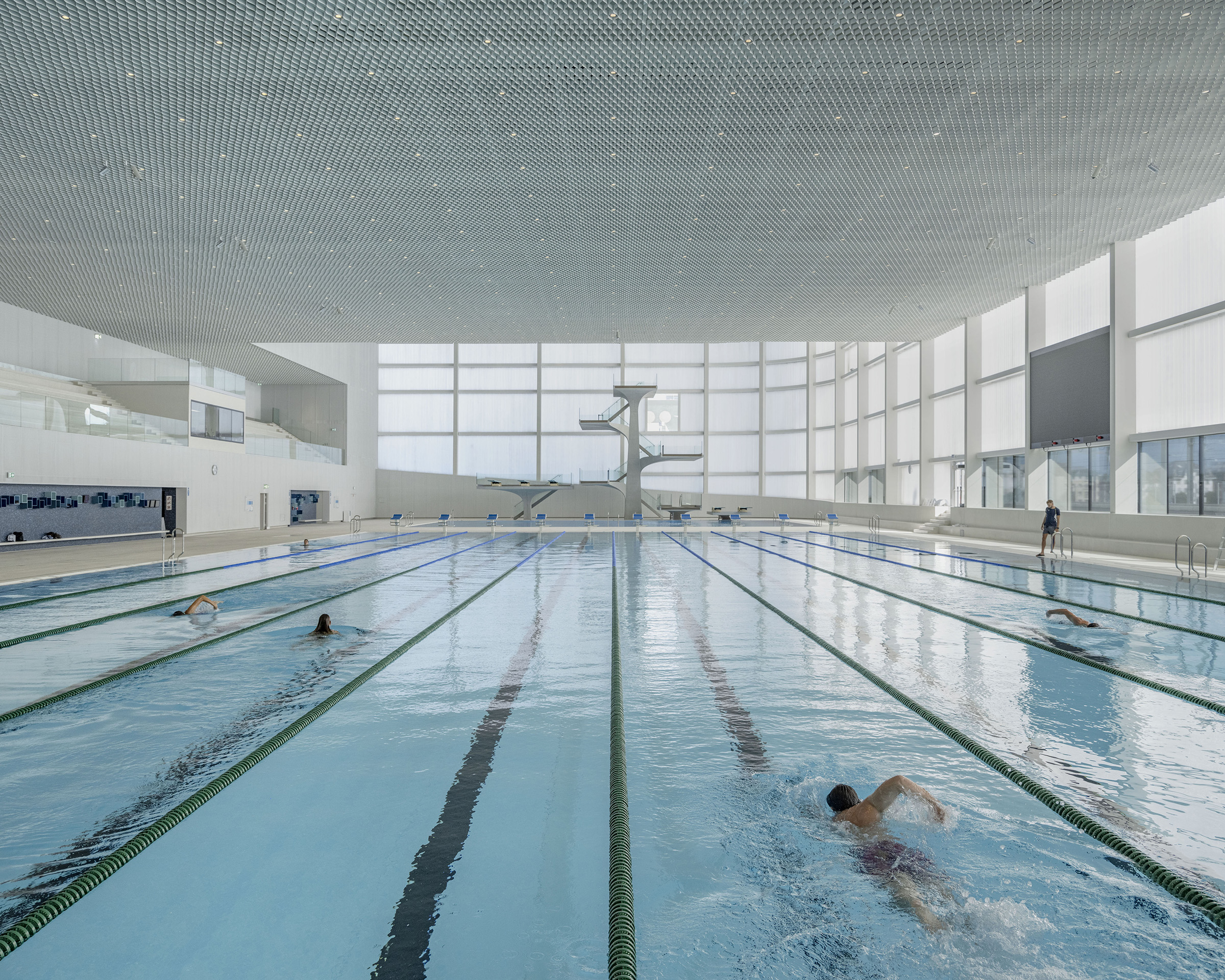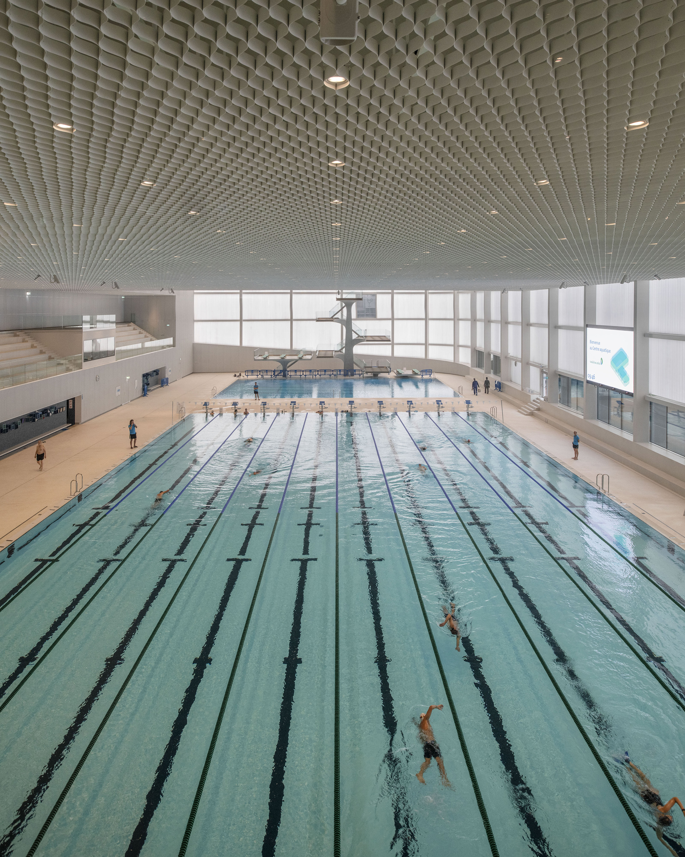 As a unique concept in the world, the rink is illuminated by continuous light strips that pass through the space. The complex lighting of the swimming pool, made up of nearly 1,000 lights inserted into the ceiling, makes it possible to create dotted lines of light accompanying the swimmers' path, but also a starry sky for leisure moments.