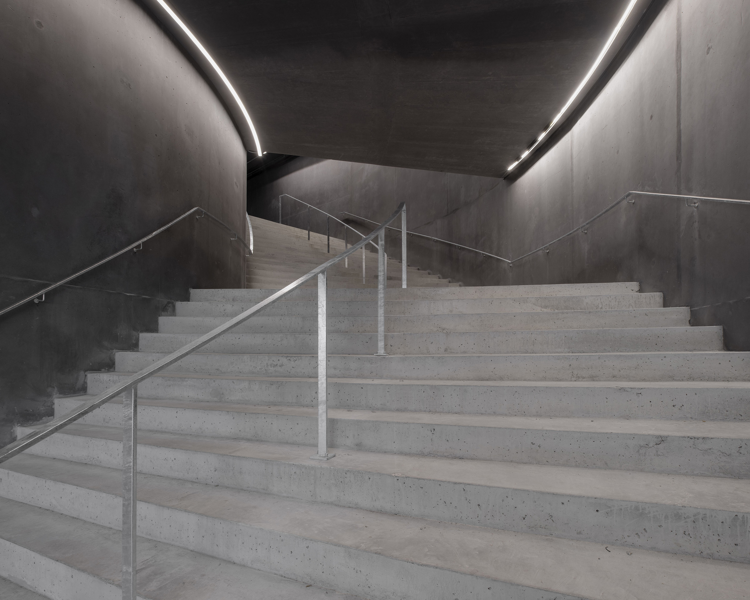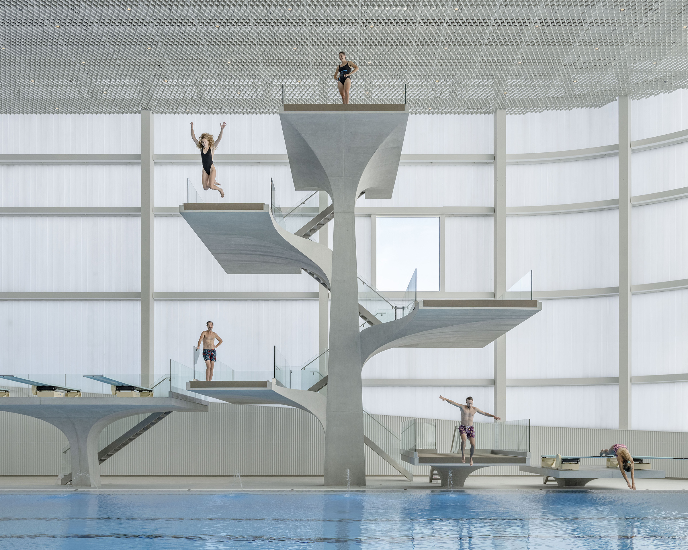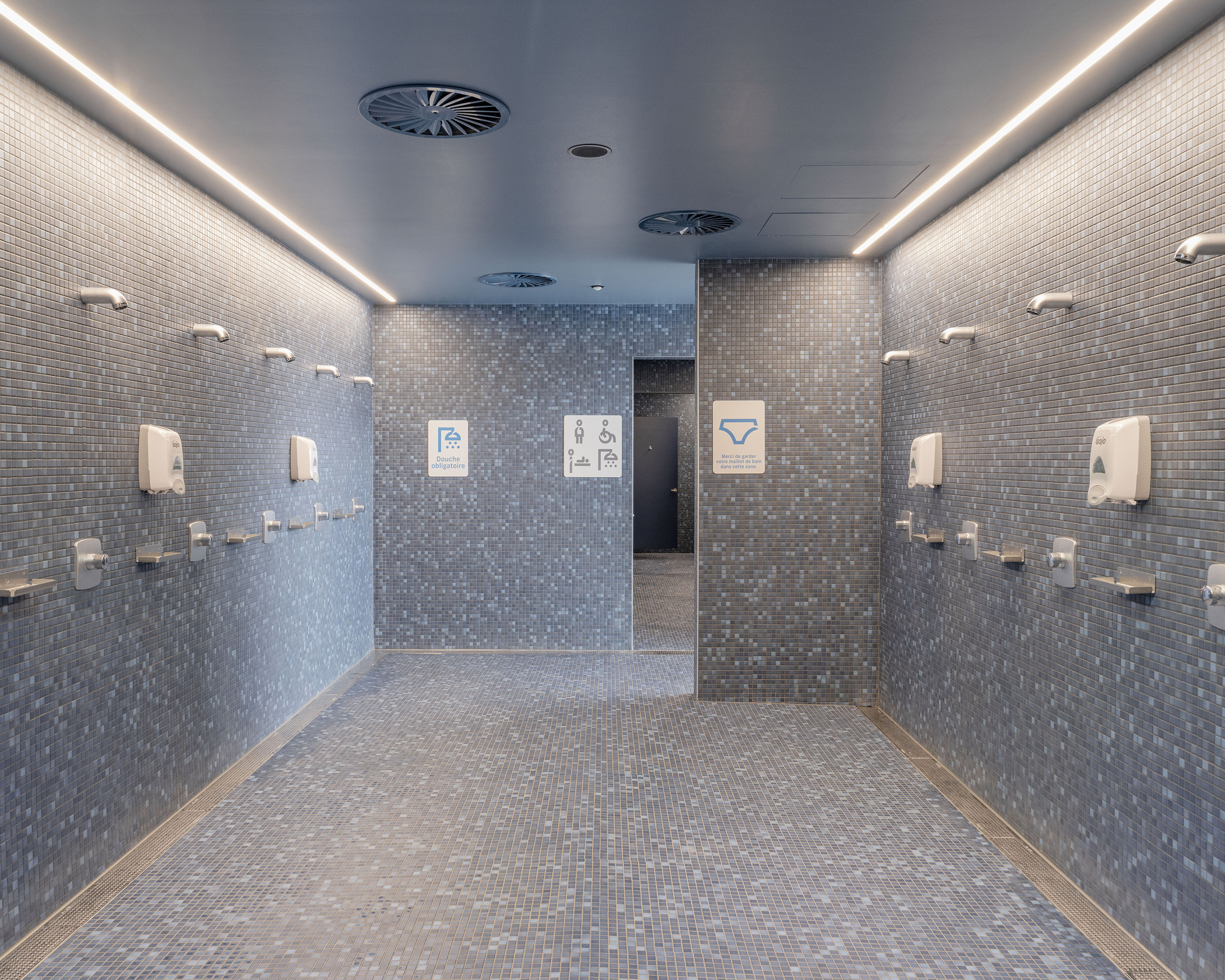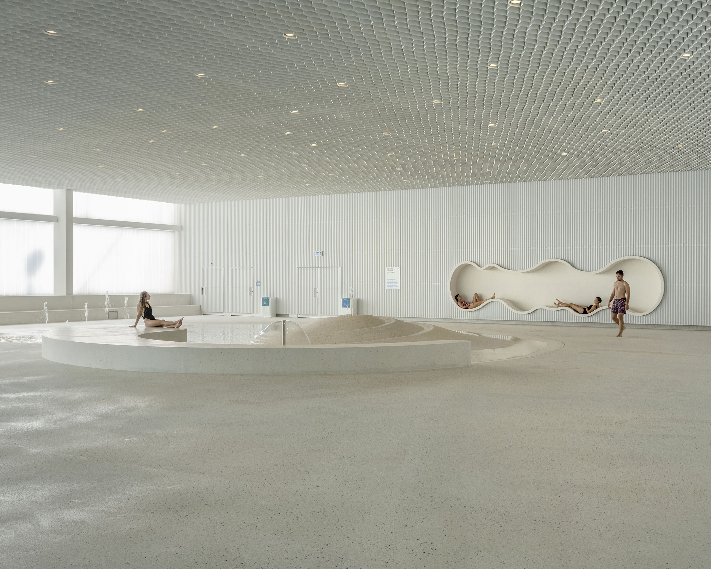 As a unique concept in the world, the rink is illuminated by continuous light strips that pass through the space. The complex lighting of the swimming pool, made up of nearly 1,000 lights inserted into the ceiling, makes it possible to create dotted lines of light accompanying the swimmers' path, but also a starry sky for leisure moments.