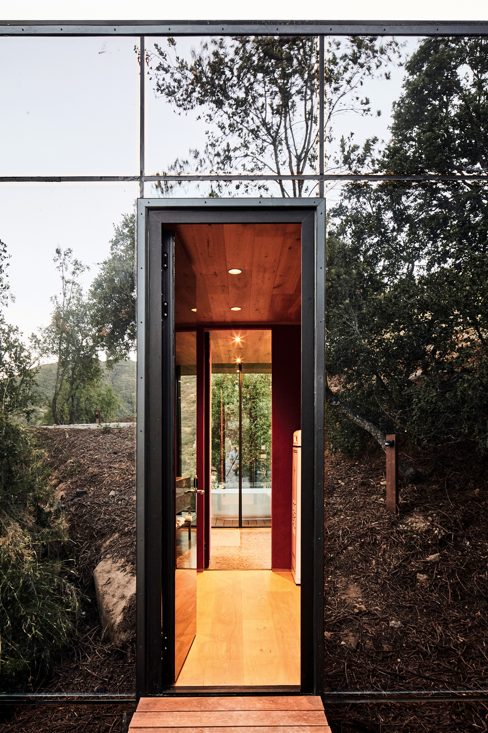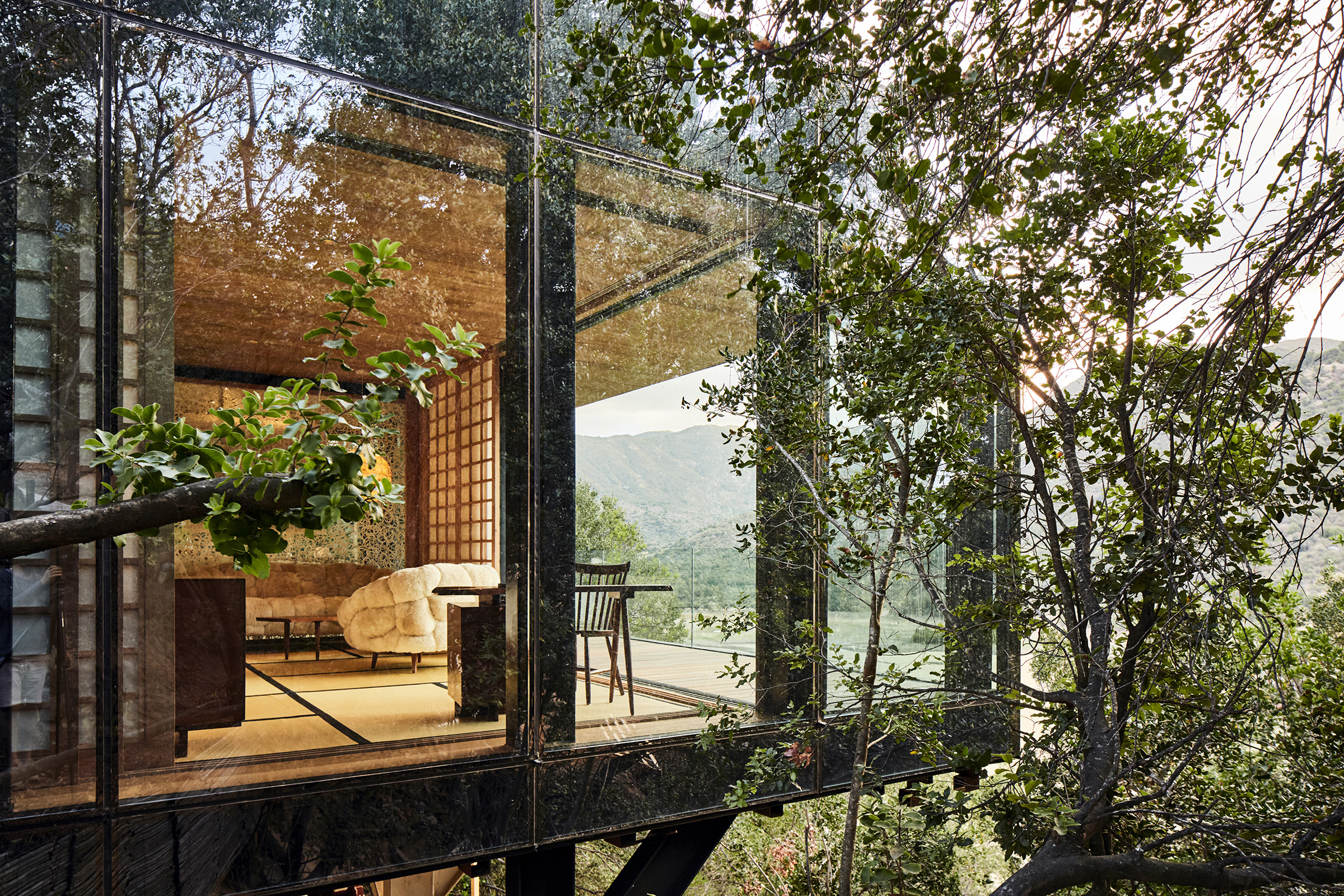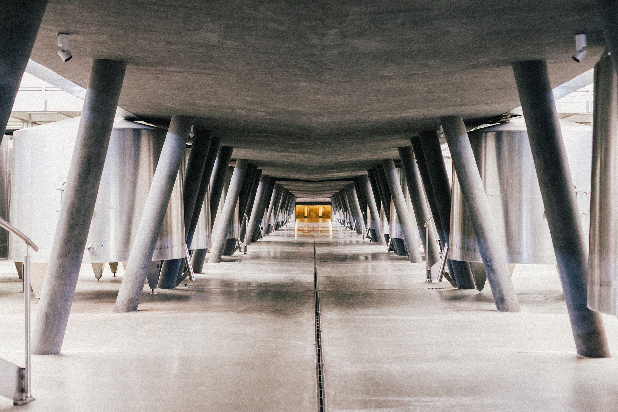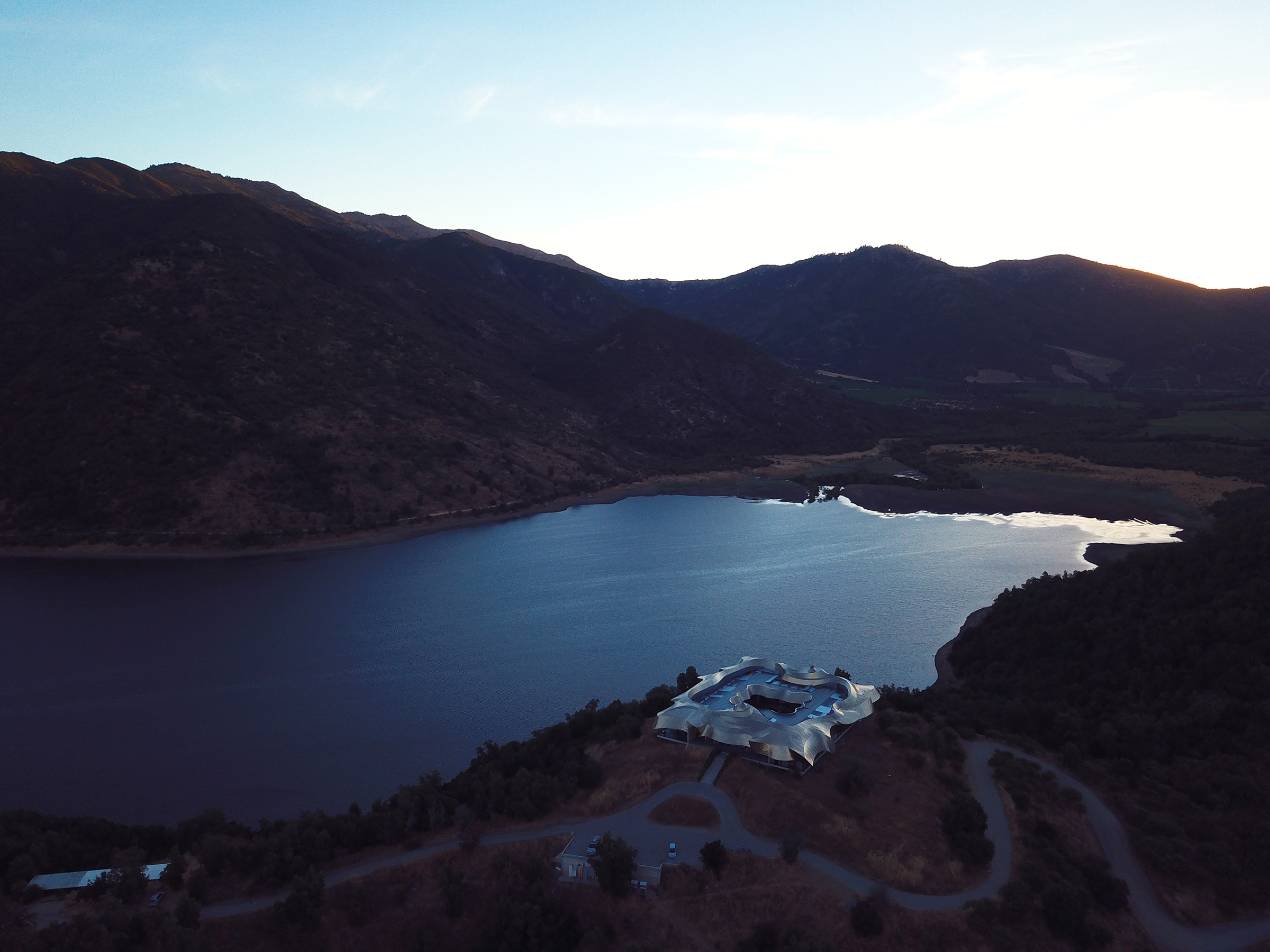 The winery’s design features a uniquely transparent, stretched fabric roof that allows for natural sunlight to permeate the winery operate without artificial lighting. The entrance to the winery is an arresting visual display of a two-degree sloping plaza of running water streaming over the space, which provides an additional cooling element. Placed throughout the plaza is a sculptural installation by Radic and sculptor Marcela Correa–Chile's inspired, talented husband-and-wife team. Walkways have been cut into the plaza, allowing visitors to walk through the water-filled landscape. The majority of the building is located underground to naturally cool the wine during the wine-making process by maintaining a consistent temperature of fifty-seven degrees using the natural thermal amplitude of the valley. The fabric roof, the primary architectural element that can be seen from the outside, gives the impression of an enormous white wing suspended over this underground winery. Both sides of the winery feature high glass walls, making the winery transparent and giving visitors a view through the winery to the pavillion on the other side.