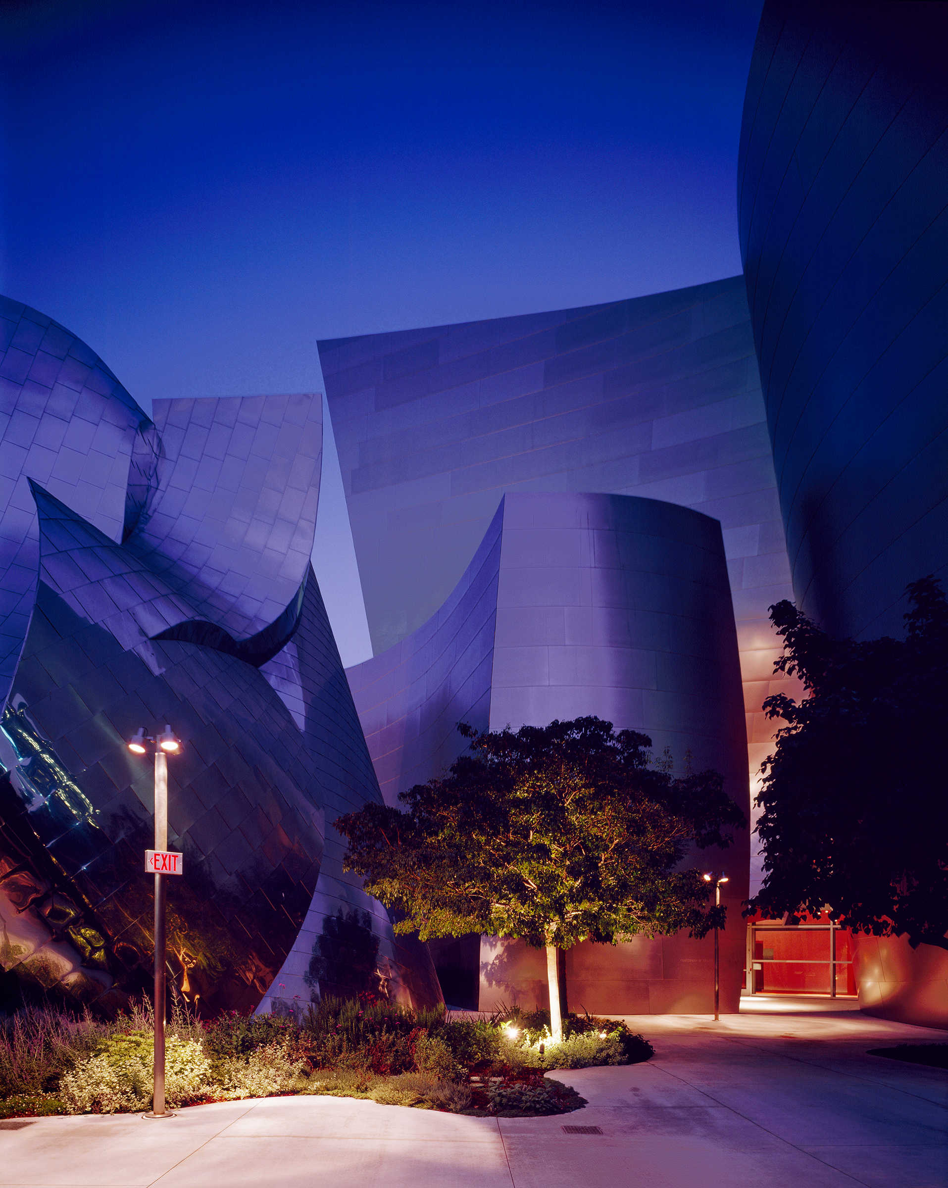 The lighting principles of the Walt Disney Concert Hall are influenced by the idea of a sequence under which people will experience the building, beginning from the street and culminating in the main hall. Light is used to guide visitors through the complex organization of spaces and to create intimate areas within the overall space. In the main hall, the primary source of light is downlighting from the ceiling. The massive scale of the room is expanded through the indirect lighting of the large open corners of the space. At night, the indirect light of the four corners replicates the effect of daylight, which enters through the large open skylights during the day.