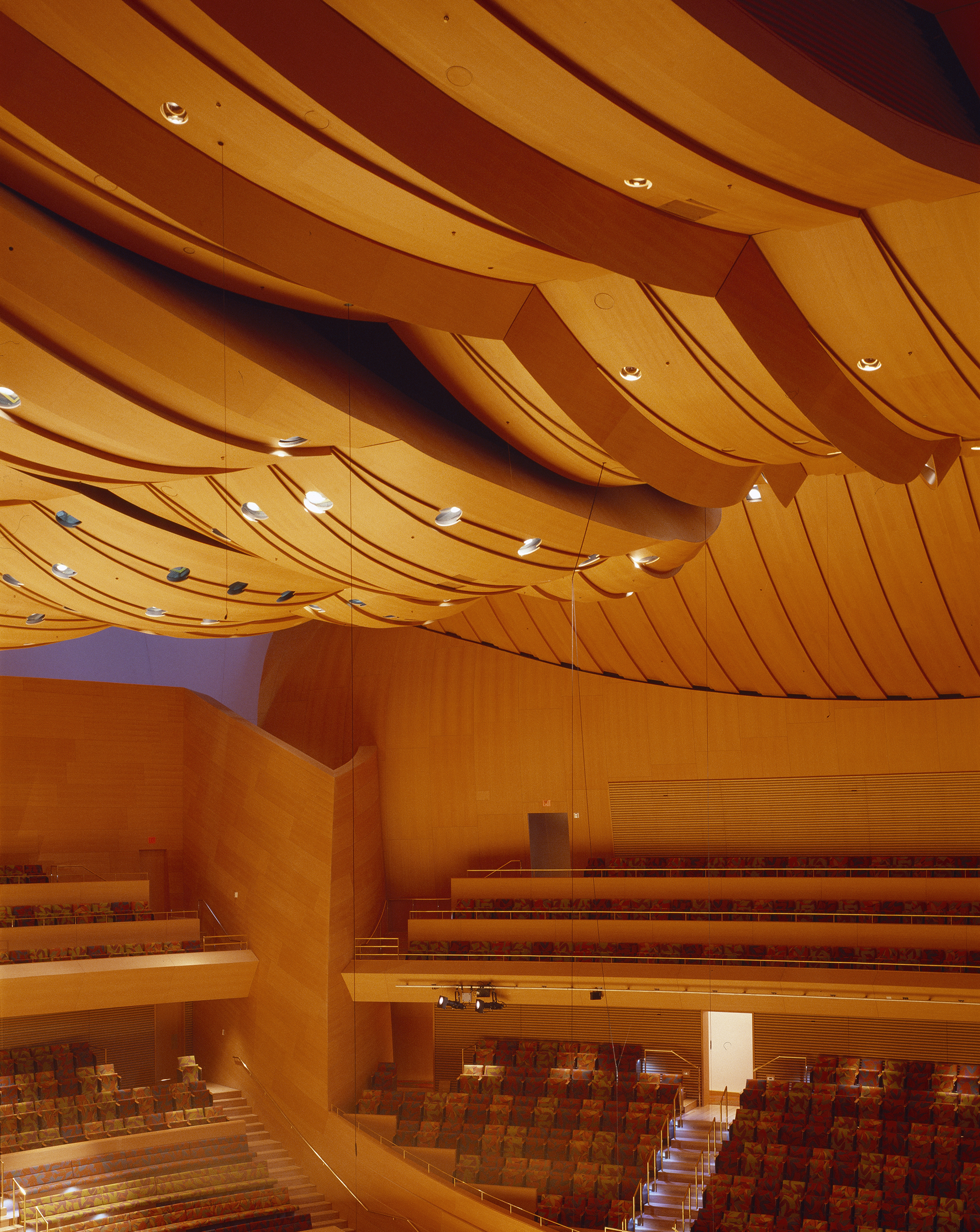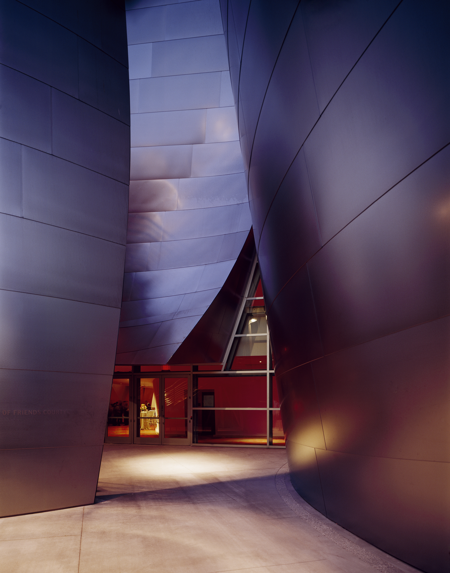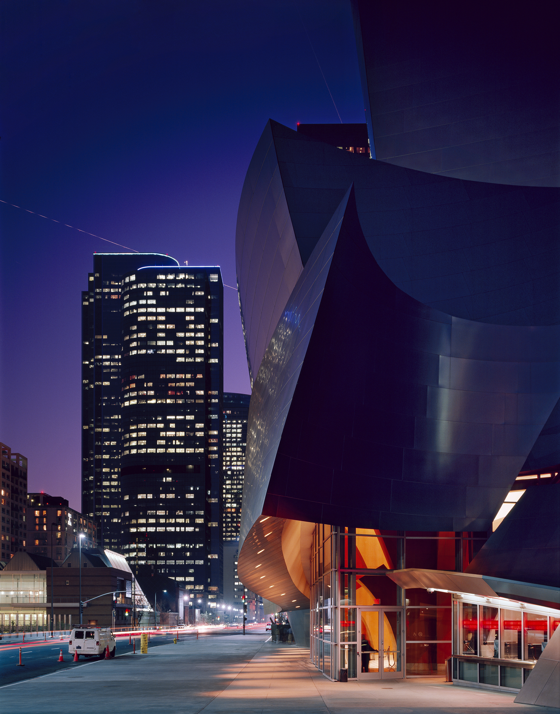 The lighting principles of the Walt Disney Concert Hall are influenced by the idea of a sequence under which people will experience the building, beginning from the street and culminating in the main hall. Light is used to guide visitors through the complex organization of spaces and to create intimate areas within the overall space. In the main hall, the primary source of light is downlighting from the ceiling. The massive scale of the room is expanded through the indirect lighting of the large open corners of the space. At night, the indirect light of the four corners replicates the effect of daylight, which enters through the large open skylights during the day.
