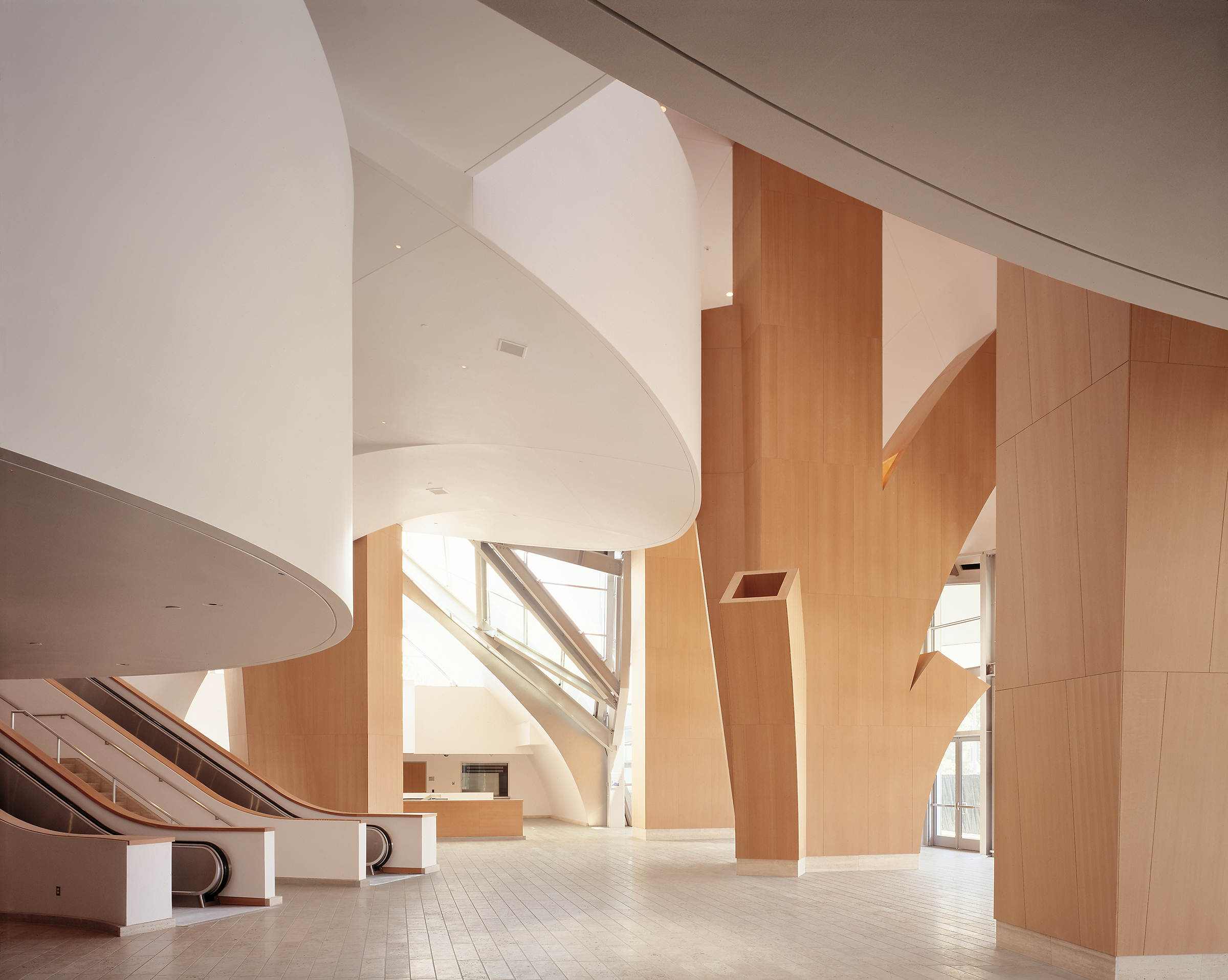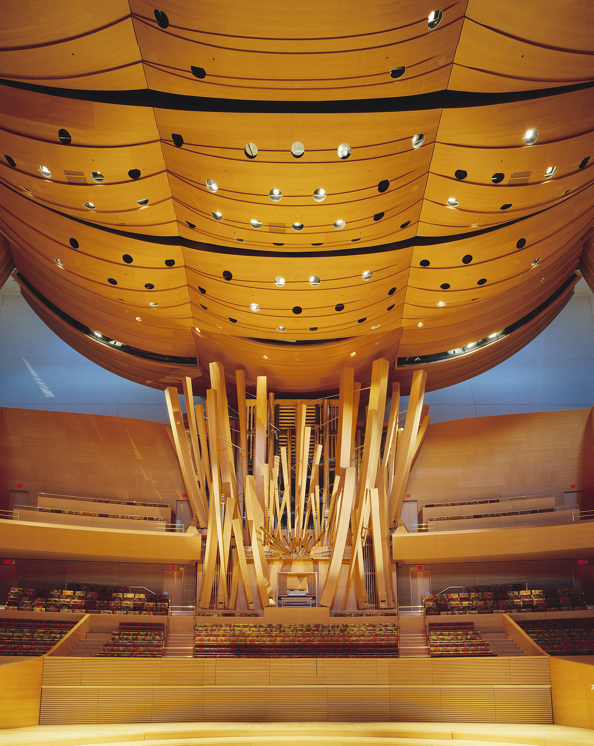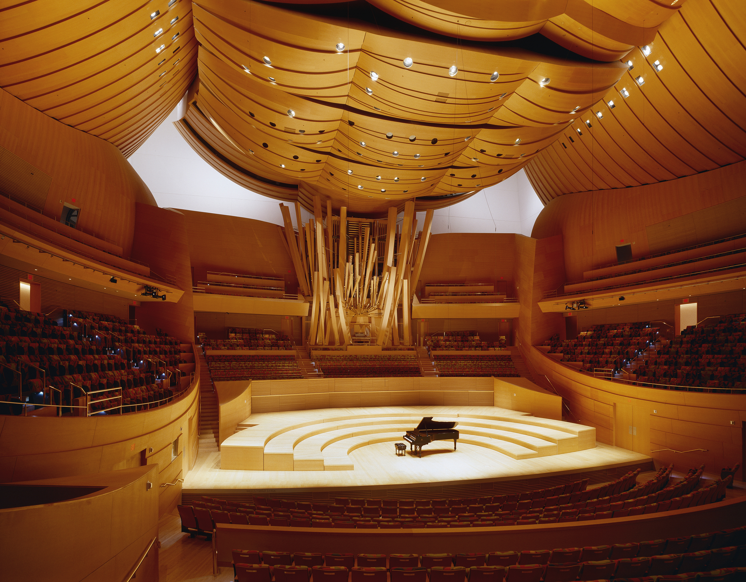 The lighting principles of the Walt Disney Concert Hall are influenced by the idea of a sequence under which people will experience the building, beginning from the street and culminating in the main hall. Light is used to guide visitors through the complex organization of spaces and to create intimate areas within the overall space. In the main hall, the primary source of light is downlighting from the ceiling. The massive scale of the room is expanded through the indirect lighting of the large open corners of the space. At night, the indirect light of the four corners replicates the effect of daylight, which enters through the large open skylights during the day.