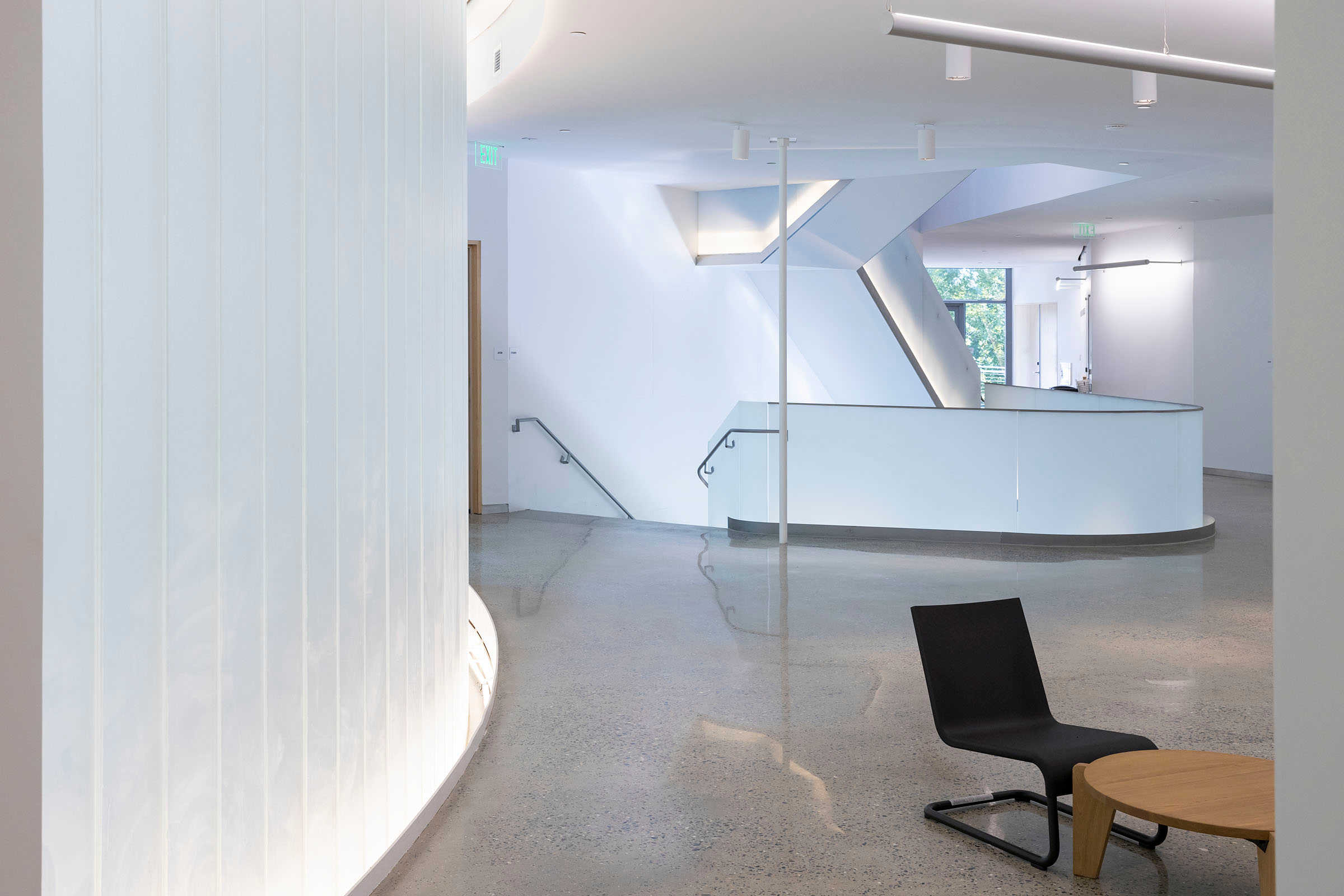 Exterior lighting was designed to amplify the unique character of the building, enhancing the elevated structure to create the impression of a floating volume. The lighting was precisely calibrated to express the blue underside of the cantilevered upper levels and reinforce the reading of the building’s concave curves.