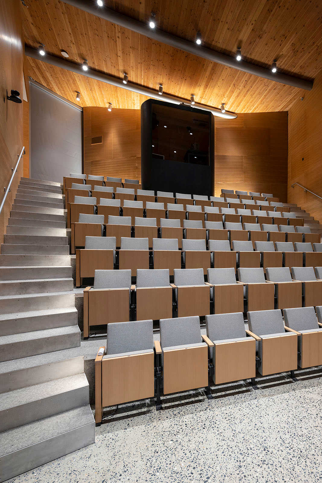 While subdued in its character during the day, the building transforms at night into a glowing beacon in the woods. Soft uplights wash the building with light from the exterior, and interior lighting radiates out as translucent and transparent planes of light.