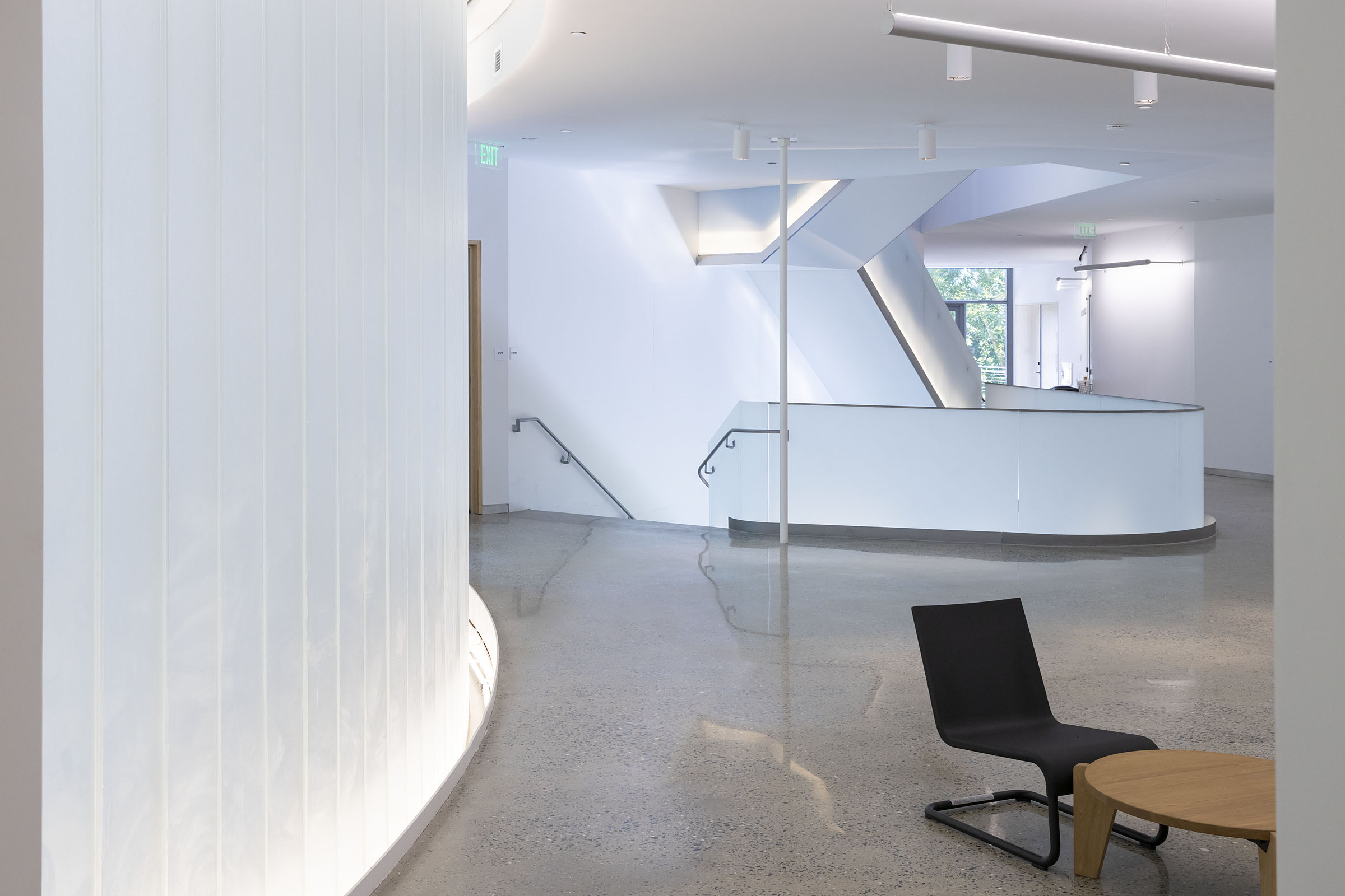 Exterior lighting was designed to amplify the unique character of the building, enhancing the elevated structure to create the impression of a floating volume. The lighting was precisely calibrated to express the blue underside of the cantilevered upper levels and reinforce the reading of the building’s concave curves.