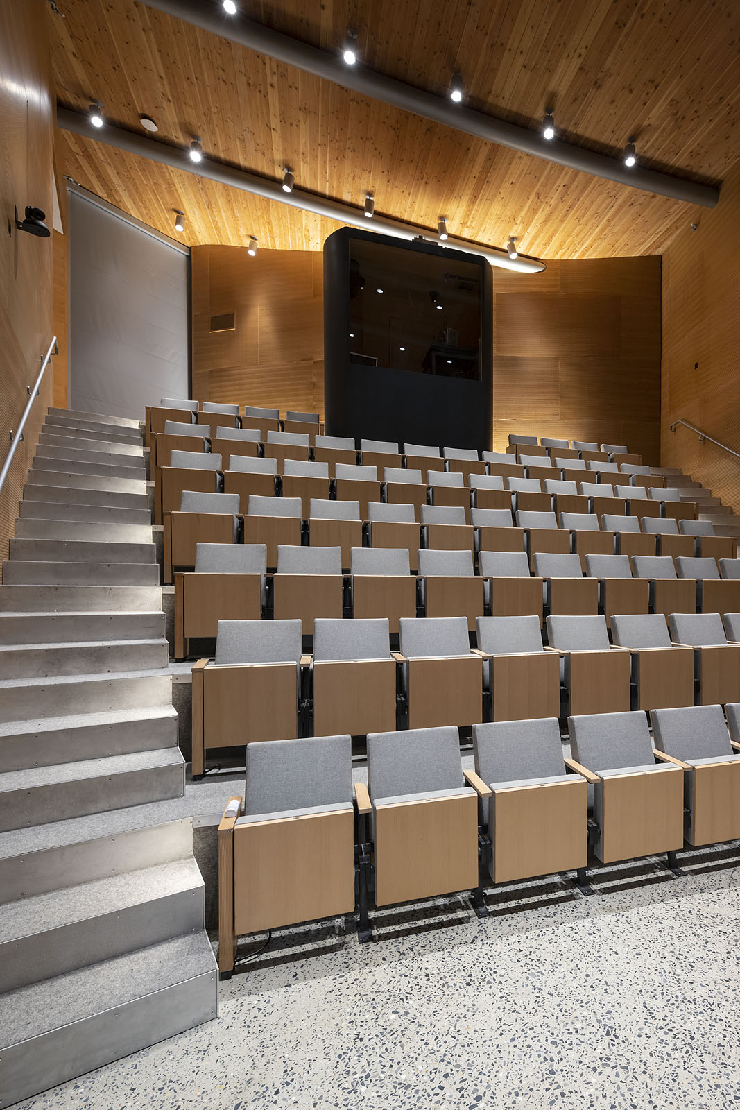 While subdued in its character during the day, the building transforms at night into a glowing beacon in the woods. Soft uplights wash the building with light from the exterior, and interior lighting radiates out as translucent and transparent planes of light.